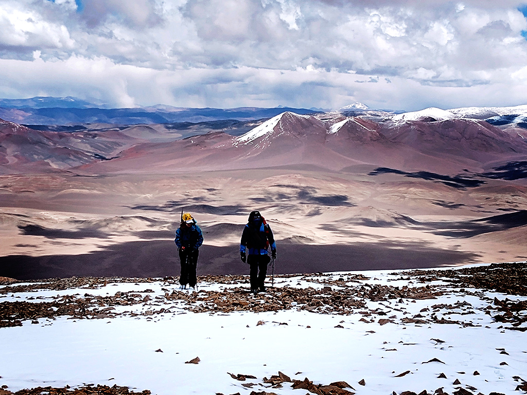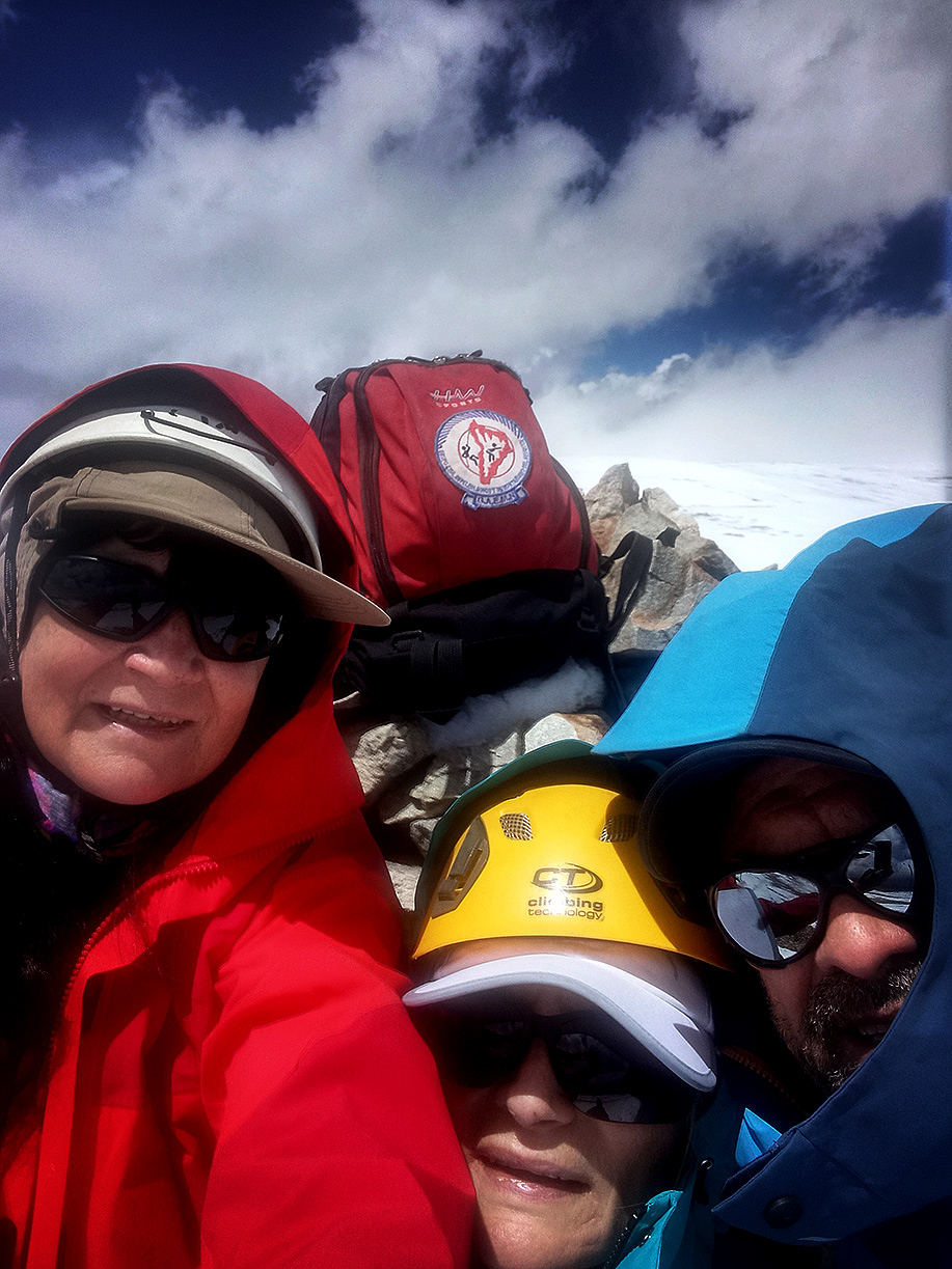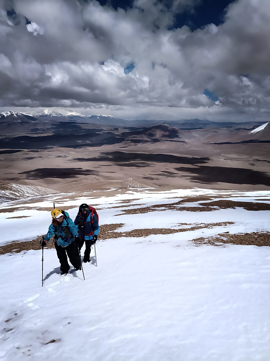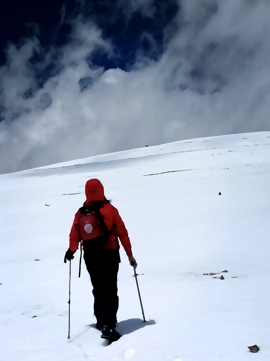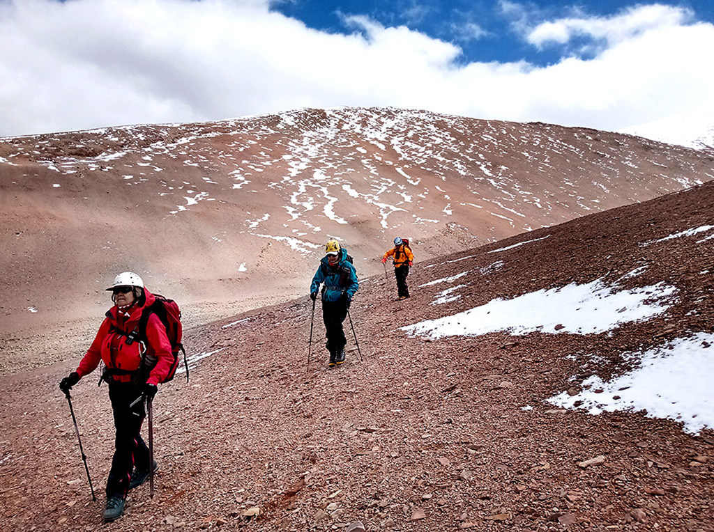 Estábamos en horario en que aún lo podíamos lograr, aunque a nuestro alrededor el cielo nublado nos hacía temblar; se veía que la lluvia caía en distintos sectores; tuvimos algo de nevisca, viento; pensábamos también en nuestra compañera, esperando que ella no estuviera bajo la tormenta y así llegamos a los 5.400 m.s.n.m. donde vimos tres elevaciones que nos sorprendieron porque todavía faltaban algunos metros para llegar a la cumbre, y no teníamos certeza de cual era...María Elena decidió detenerse a descansar apoyada en su mochila y en ese momento, Graciela le pidió a Roberto que siguiera, que encontrara la cumbre.., ¡sí o sí!… estábamos tan cerca. Roberto la miró y salió, muy despacio dado que ya todos estábamos bastante cansados, a cumplir nuestro deseo.