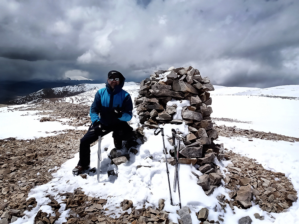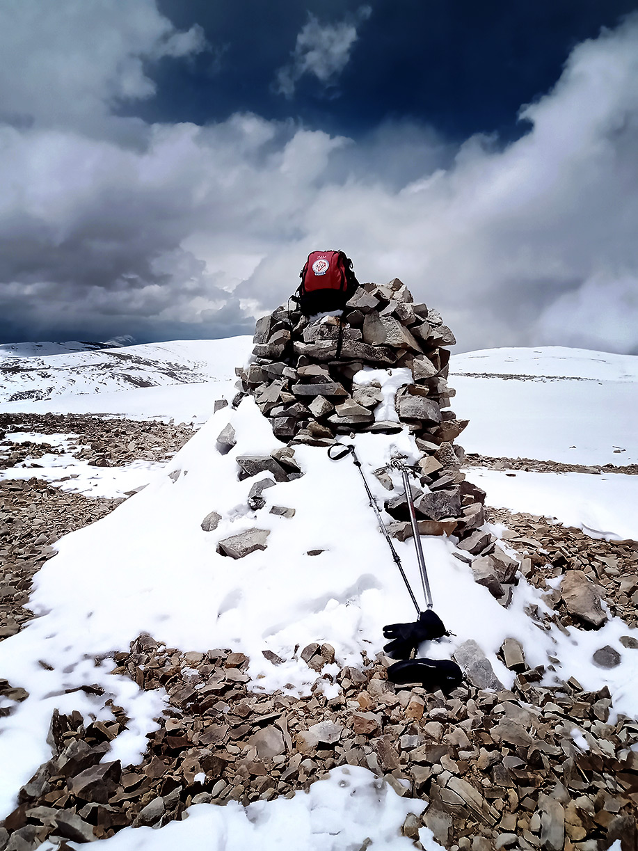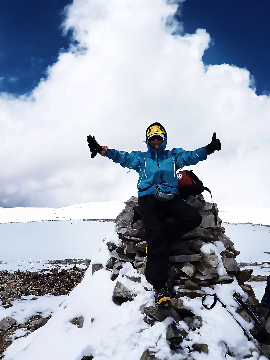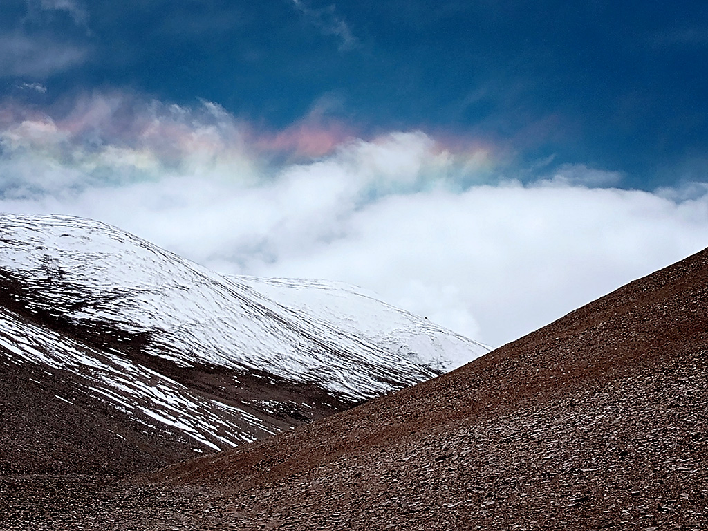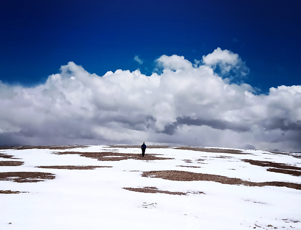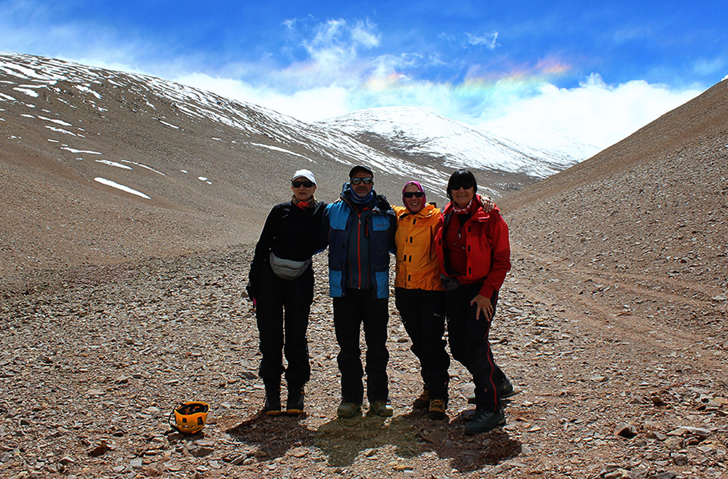 Estábamos en horario en que aún lo podíamos lograr, aunque a nuestro alrededor el cielo nublado nos hacía temblar; se veía que la lluvia caía en distintos sectores; tuvimos algo de nevisca, viento; pensábamos también en nuestra compañera, esperando que ella no estuviera bajo la tormenta y así llegamos a los 5.400 m.s.n.m. donde vimos tres elevaciones que nos sorprendieron porque todavía faltaban algunos metros para llegar a la cumbre, y no teníamos certeza de cual era...María Elena decidió detenerse a descansar apoyada en su mochila y en ese momento, Graciela le pidió a Roberto que siguiera, que encontrara la cumbre.., ¡sí o sí!… estábamos tan cerca. Roberto la miró y salió, muy despacio dado que ya todos estábamos bastante cansados, a cumplir nuestro deseo.