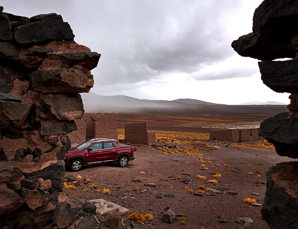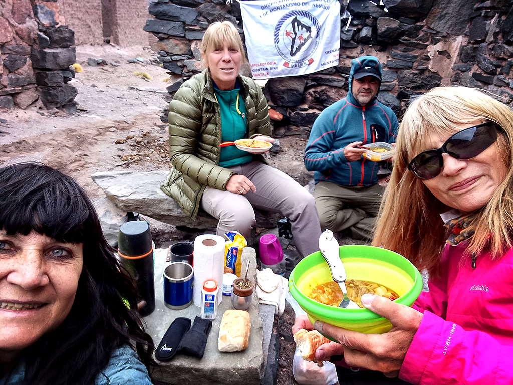 Nuevamente en el campamento y sin descansar, Roberto y Celina debieron regresar a Fiambalá, 90 km, a buscar agua (la vertiente que debía proveerla estaba seca) y combustible dado que las distancias son muy extensas y corríamos el riesgo de que se acabara. Llovió toda La noche, una de las carpas se inundó, la parte buena es que al día siguiente un sol bondadoso nos permitió secar todo, tomar mate mirando las aves de la laguna y al regreso de nuestros compañeros, en el medio de la nada, comer un increíble asado, a cargo de Roberto.