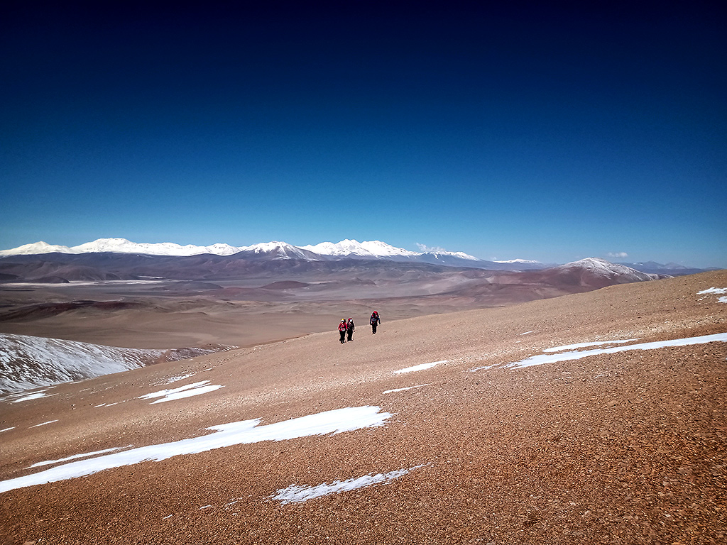 Al día siguiente, muy temprano estábamos listos para intentarlo nuevamente, y elegimos para hacerlo un lugar situado más adentro del Abra del Matambre (27°34'48.23"S 68°19'38.84"O), 4.650 msnm, aunque no era el lugar indicado por Guillermo Almaraz, que era un poco más al sur. Inconscientemente creo que queríamos explorar por nuestra cuenta y encontrar la cumbre. Comenzamos a ascender suavemente, con sol, bajo un cielo increíble, incluyendo descansos y paradas de hidratación hasta los 5.100 m.s.n.m. donde nuestra compañera Celina, decidió detenerse. Se encontraba estable de salud, pero no había descansado bien la noche anterior, estaba preocupada porque se nos estaban terminando las reservas de agua y combustible y había que ir, a nuestro regreso, a Fiambalá a buscar los suministros.