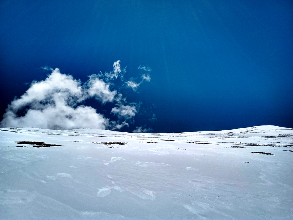 A partir de ese momento, continuamos ascendiendo por acarreo, sorteamos algunas piedras grandes, los crampones no resultaron necesarios porque el manto de nieve era muy suave y blando por el horario y realmente era muy agradable la travesía, aunque dificultosa… porque no podíamos establecer la cumbre. A medida que avanzábamos aparecían distintas elevaciones muy similares, vimos 4 posibles cumbres que carecían de la pirca que los topógrafos militares habían dejado en la década del 40. Tampoco el GPS nos daba la altura de cumbre.