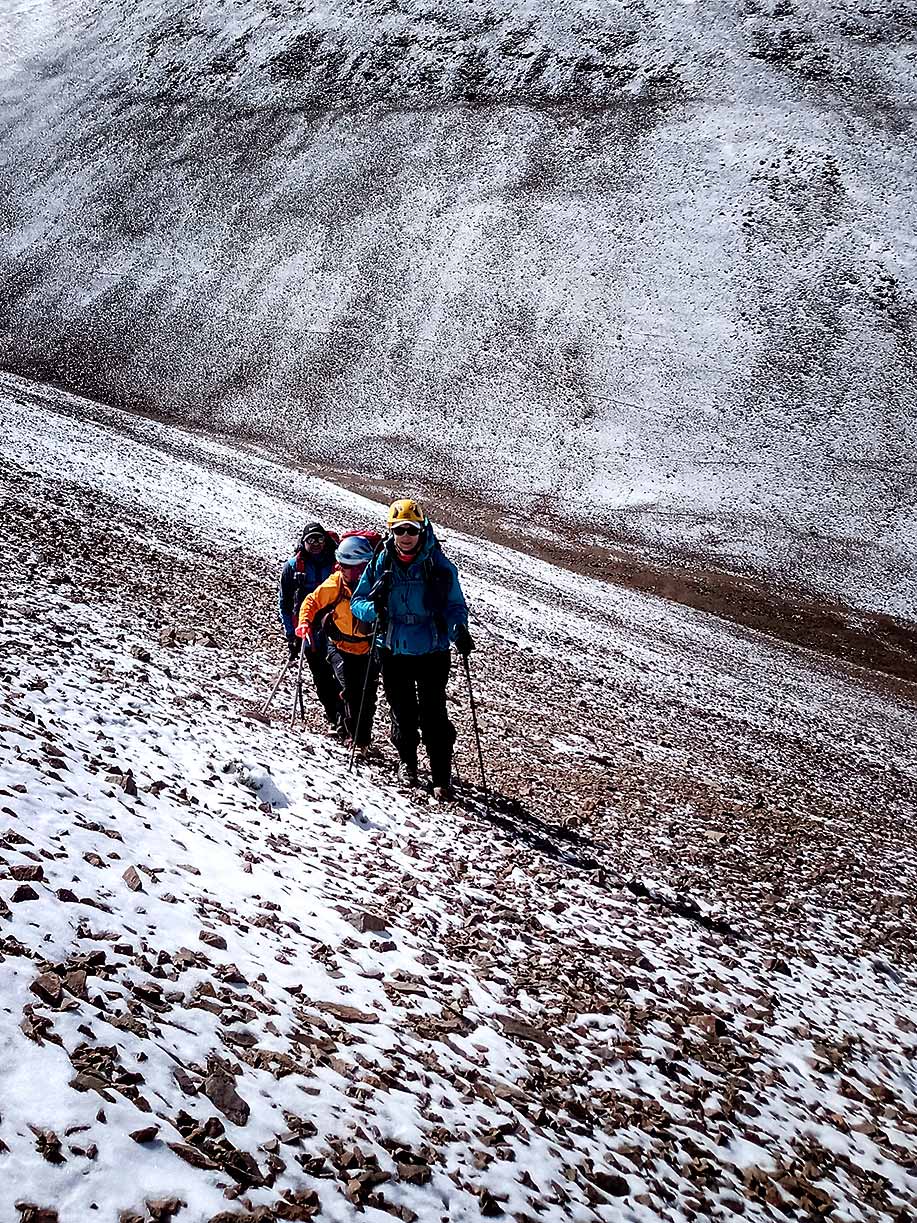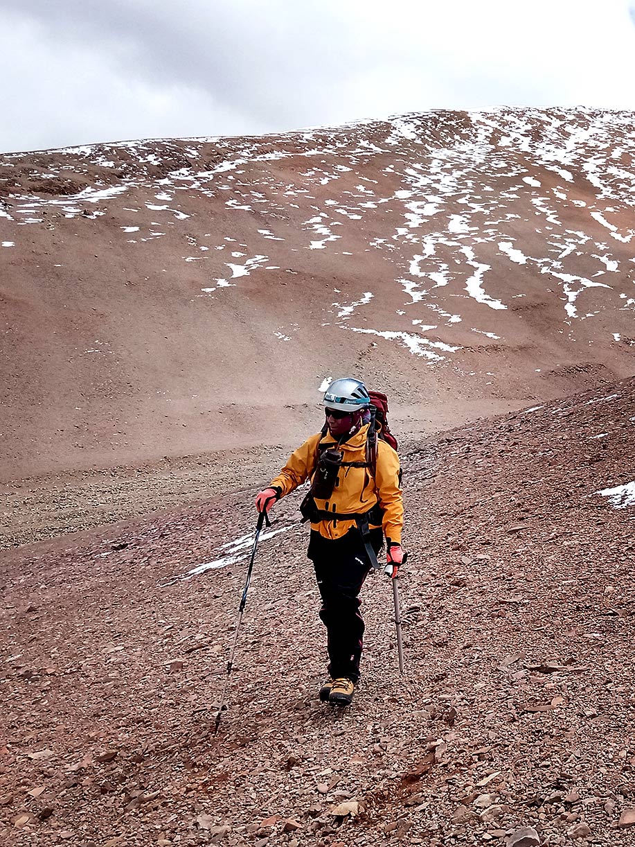 Después de subir zigzagueando hacia la lomada principal hasta una altura de 4.950 m.s.n.m., nos dimos cuenta que había una quebrada entre nosotros y esa aparente cumbre, y que además en ese momento el horario ya no era el adecuado para seguir intentando el ascenso, motivo por el cual, en forma inmediata, decidimos descender, regresar al campamento y volver al día siguiente para ascender por la lomada de enfrente, que parecía más amigable para encarar en forma directa la montaña.