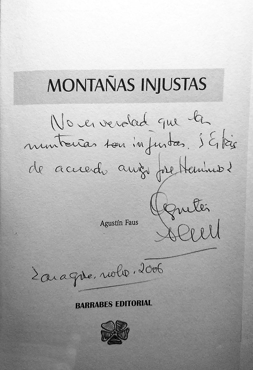 Bernabé Aguirre López, lo despedía con estas palabras: Hoy es un día triste, nos dejó Agustín Faus, Montañeru Escritor y sobre todo mi amigo, le conocí personalmente, mucho antes su literatura, en el principio del año noventa en su hotelito de Villanía, en aquellos momentos hacia una columna de Montaña en el periódico el Pirineo de Jaca, nos caímos bien, y desde ese momento mantuvimos emocionantes charlas de montaña, evidentemente con nuestros encuentros y desencuentros, pero eso sí, con muchísimo respeto y por mi parte con una inmensa admiración hacia su persona y todo lo que representaba en el mundo común de la montaña, la última vez que estuve con El, fue en la residencia donde se encontraba en Santander ya que le fui a entregar un premio que le había concedido los premios literarios Cuentamontes y que me pidió su amigo Manolo Maestre se lo llevase, su hija ya me dijo que la memoria le fallaba algo, pero mi alegría fue enorme cuando después de unos segundos me reconoció y charlamos como siempre de nuestras montañas y amigos, como bien dice esa canción, la muerte no es el final, hoy te siento más cerca que nunca y en mi recuerdo quedará para siempre esas horas días y años en los que convivimos en las montañas y fuera de ellas un beso enorme de tu amigo donde estés que seguro me seguirás cuidando D.E.P