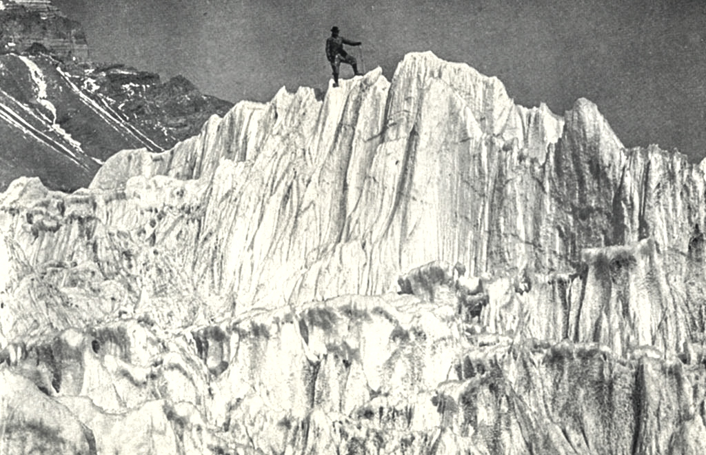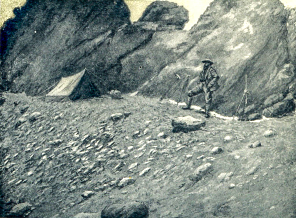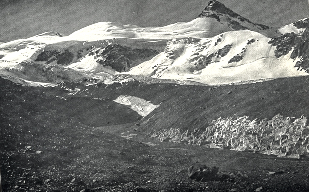 La vegetación había cesado y aparecieron vastos espacios lisos de detritos, de casi media milla de ancho. Al mediodía avistamos el lugar donde Zürbriggen estableció su campamento intermedio bajo un pico de forma de horca. Allí almorzamos y luego continuamos el viaje; el aspecto del valle comenzó a cambiar, en vez de lechos planos de nieve atravesamos grandes acumulaciones de nieve sin derretir.