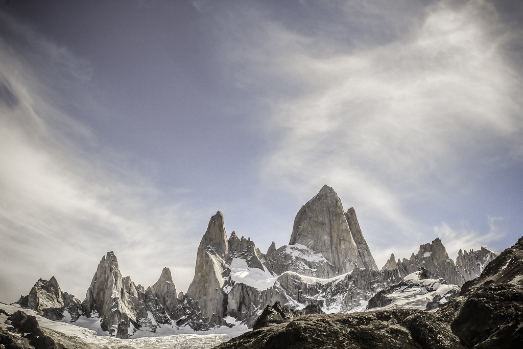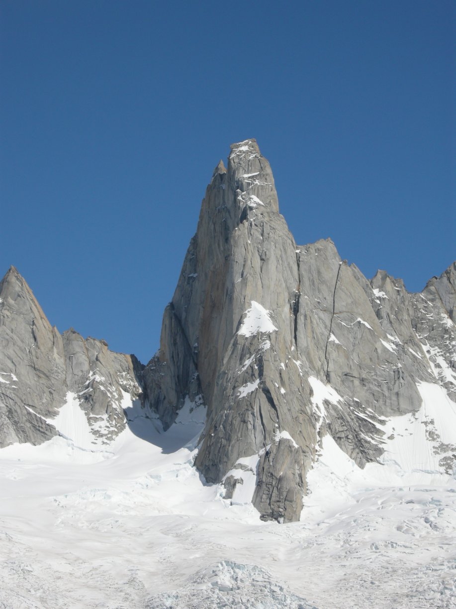 Al Noreste y a unos 20 kilómetros de distancia, divisamos por primera vez el imponente Fitz Roy y su cortejo de agujas. Mis camaradas, observaban el Fitz con los prismáticos y desde lejos subestimaban las dificultades. Pensaban que la vía estaba llena de fisuras y chimeneas, como las agujas graníticas de los Alpes.