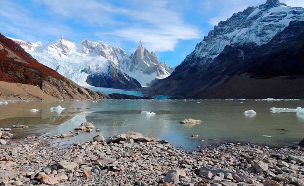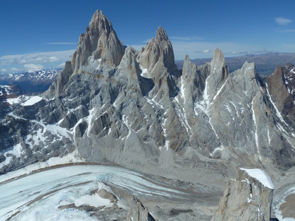 El Fitz Roy, de 3.405 metros SNM., se encuentra a 5 kilómetros más al Este, al centro de un pequeño cordón paralelo de 6 kilómetros de diámetro. Entre los dos se encuentra un valle extremadamente encajonado, ocupado por el glaciar del Torre. Este glaciar, se expande hacia el Sur y va unirse a los glaciares Adela y Grande, para terminar en un pequeño lago, denominado la laguna Torre.