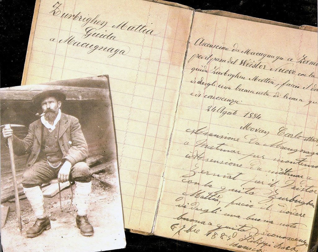 Gracias a contactos con viejos guías, luego dueños de albergues, empezó a acompañar a alpinistas para emprender pequeñas expediciones a cerros tales como el Weisstor, el monte Moro y otros y como todo guía de la época fue plasmando sus experiencias en su pequeña libreta o también llamado libro del guía, en donde además, sus expedicionarios iban colocando sus impresiones, acompañadas de las fechas.El primer registro fue el 26 de agosto de 1884, y lo firma Movay Carlo di Martigny, el cual, luego de una travesía desde Macugnaga a Zermatt, por el Weisstor Nuevo, le escribió una muy buena referencia de su desempeño haciendo referencia a los conocimientos de guía; recordemos que este documento para los guías era como una carta de presentación o recomendación en esa época.