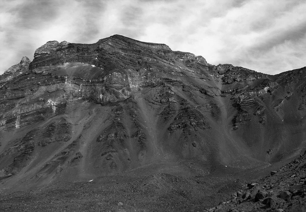 A las 04,45 horas, alcanzamos el primer pedazo de nieve situado más o menos a 2.130 metros, continuamos luego nuestro camino por monótonos faldeos de cenizas volcánicas mezcladas con piedra pómez.