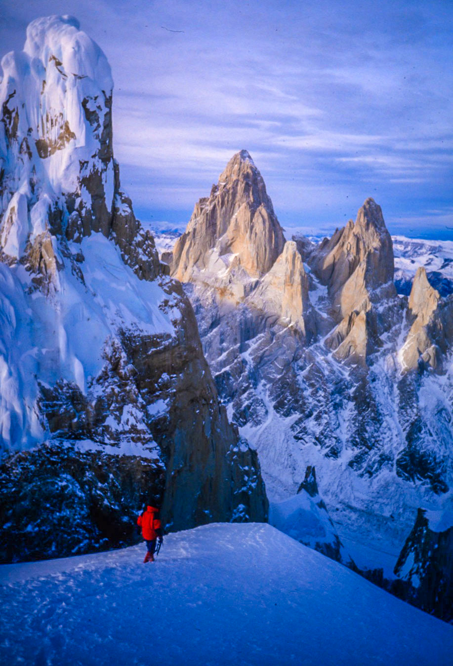En 1986, antes de un curso de Hielo al Tronador, fuimos al Cerro Catedral. Durante dos días, con un vivac en una buena terraza, escalamos la Vía del Orco, bautizada con ese nombre en el relato de Tolkien que leíamos en la Base del Fitz Roy. Ese mismo año, la apuesta subió para hacer la primera Invernal al Fitz Roy por la Supercanaleta. Fueron Gabriel Ruiz Sebastián de la Cruz y Eduardo. Con menos apoyo del esperado, encararon directo, pasando por Piedra del Fraile, a la base de la Supercanaleta. El tiempo se presentaba bueno más allá de los días cortos y las noches frías. Subieron sin bolsas de dormir para acelerar la escalada en ensamble.
