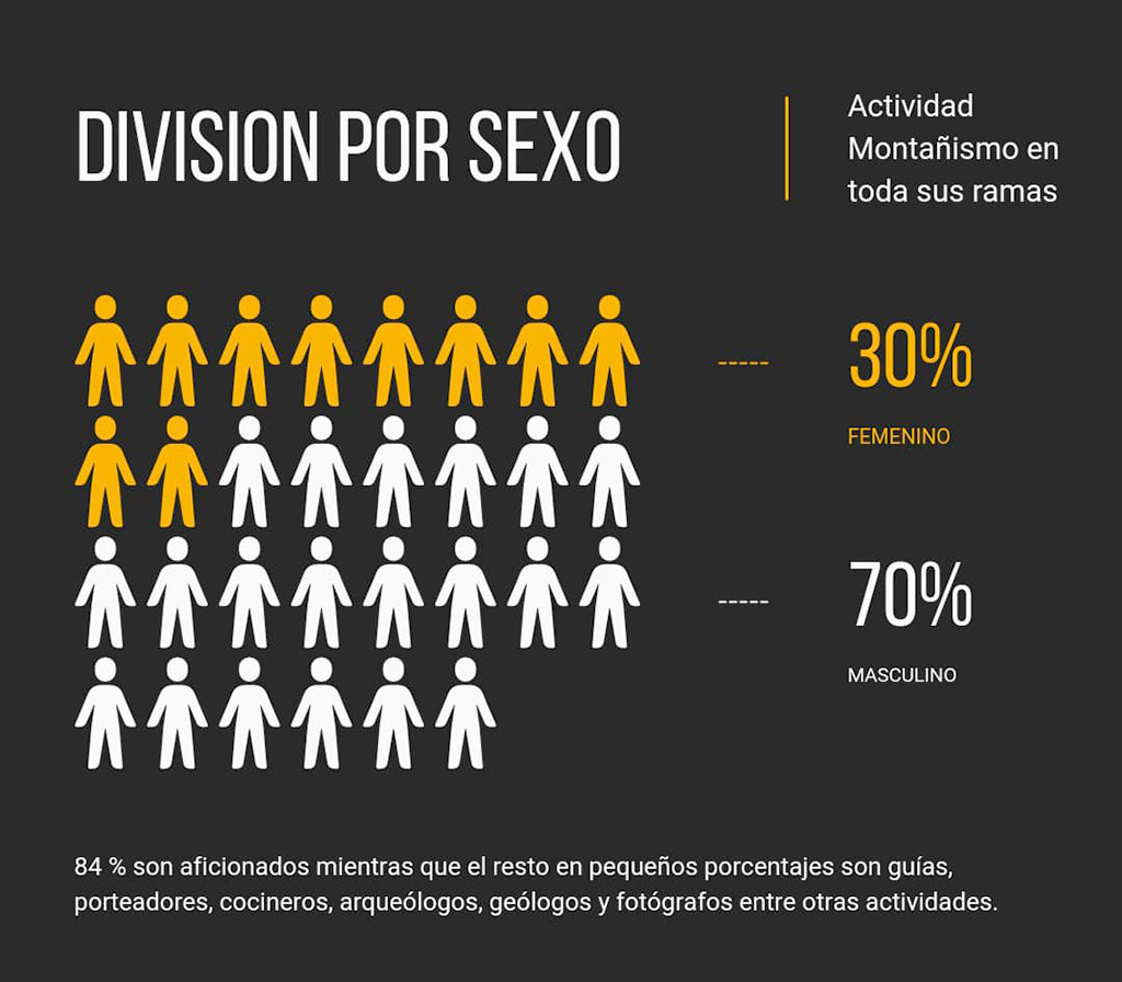 En la actualidad el montañista pertenece en un 70% al género masculino y siendo el 30 % mujeres.