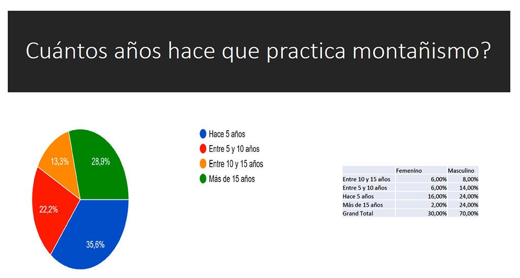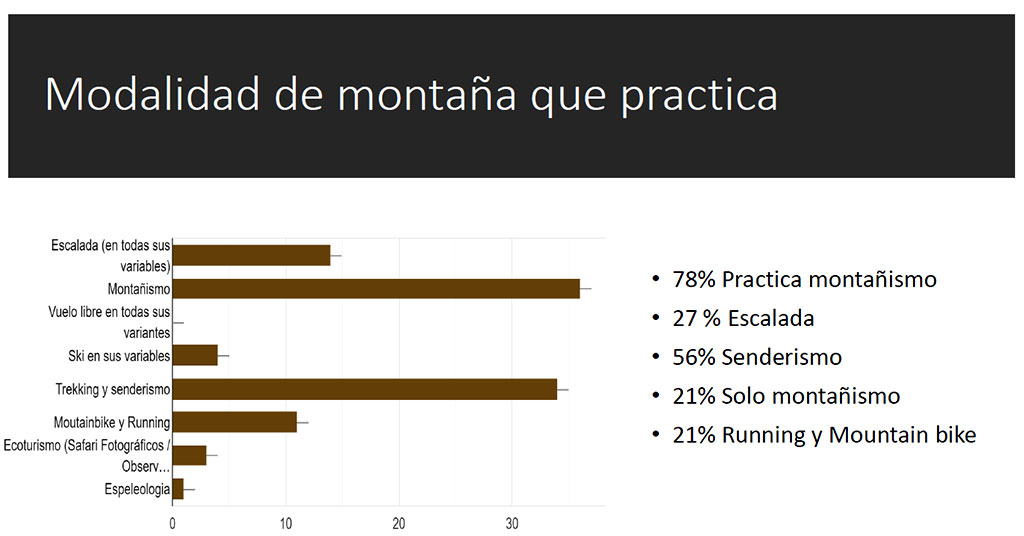 Siendo más específico en la depuración de actividades, se ve reflejado que el montañismo, (tomándolo como caminar hacia una cumbre) es la actividad más desarrollada, seguida por la de los escaladores. Sobre esta última, tenemos que diferenciar, que la roca es más tentadora que el hielo, como también que la modalidad Boulder, es muy apetecible, siendo sus cultores una interesante franja de jóvenes. También, los que practican mountain bike tienen su lugar en el monte. Desglosando por actividad pura (aunque existe el entrecruzamiento como, montañismo y senderismo, o montañismo y escalada, mountain bike y running o running y montañismo) podemos decir que el 78 % practica montañismo, 27 % escalada en sus diferentes formas, 56 % senderismo, 21 % running y mountain bike, entre otros, y las personas que practican ski sólo se reflejaron en un 3 %.