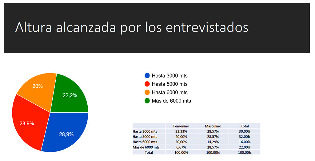 En cuanto a las alturas de las montañas escaladas puede concluirse que los hombres buscan el desafío de las mayores alturas, el 60 % han escalado hasta 5000 metros, el 30 % hasta 3000 metros y el 3 % superan los seis miles (en su mayoría han sido escalados por varones)