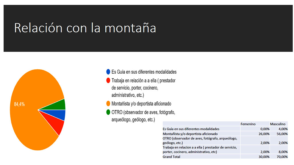 De las personas encuestadas un.84% son aficionados, mientras que el resto, en pequeños porcentajes son guías, porteadores, cocineros, arqueólogos, geólogos y fotógrafos.