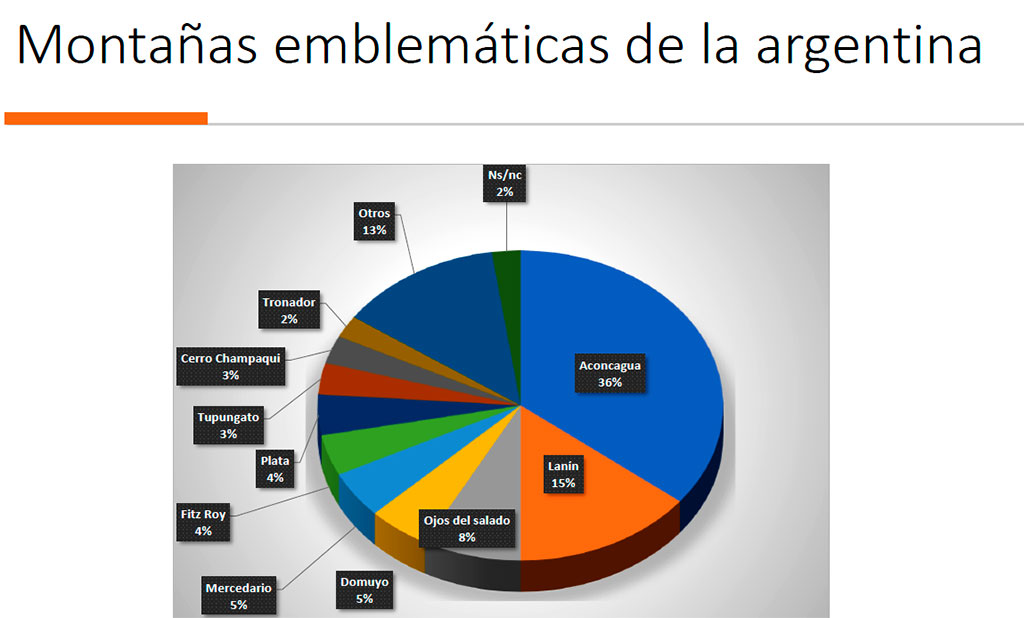 Consultados sobre ¿cuál es la montaña que representa a la República Argentina, El Aconcagua, es el monte más nombrado con un 36 %, seguido muy lejos por el Volcán Lanín con un 15% y en tercer lugar por el Ojos Del Salado (8%), más atrás se encolumna, el Plata, el Fitz Roy, el Domuyo y el Mercedario, entre otros.