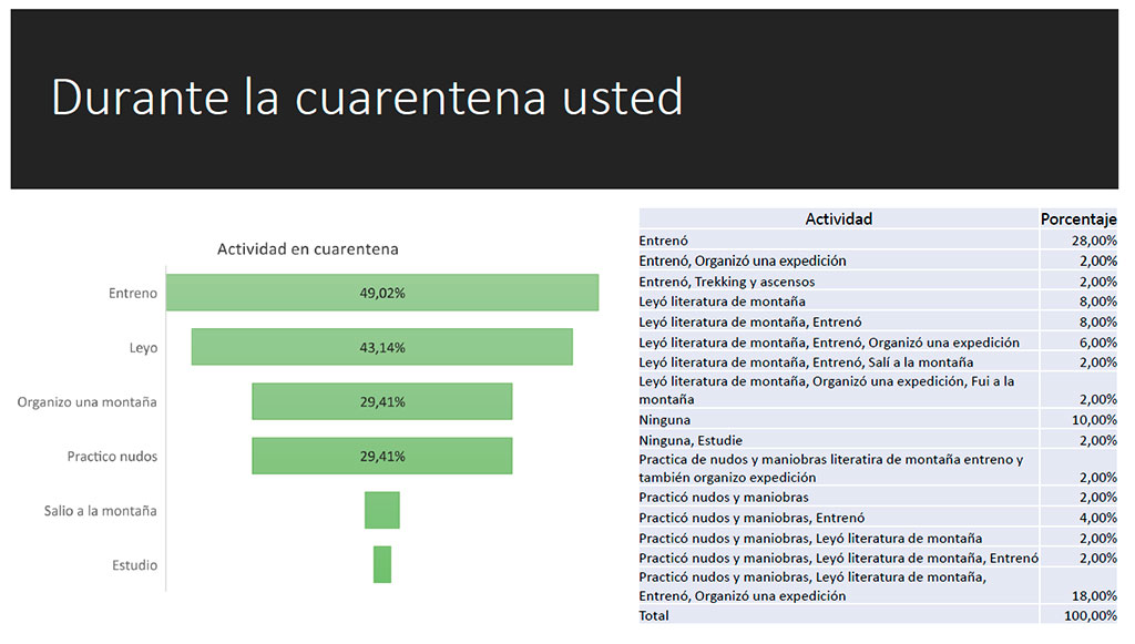 Durante la pandemia, los montañistas realizaron diferentes actividades, entre las más valoradas se encuentran el entrenamiento (72%), leyó literatura de montaña (47%) y la organización de alguna expedición (27%), como también la práctica de nudos (29%). Solo un 10. 5 no tuvo actividad relacionada con la montaña en casa.