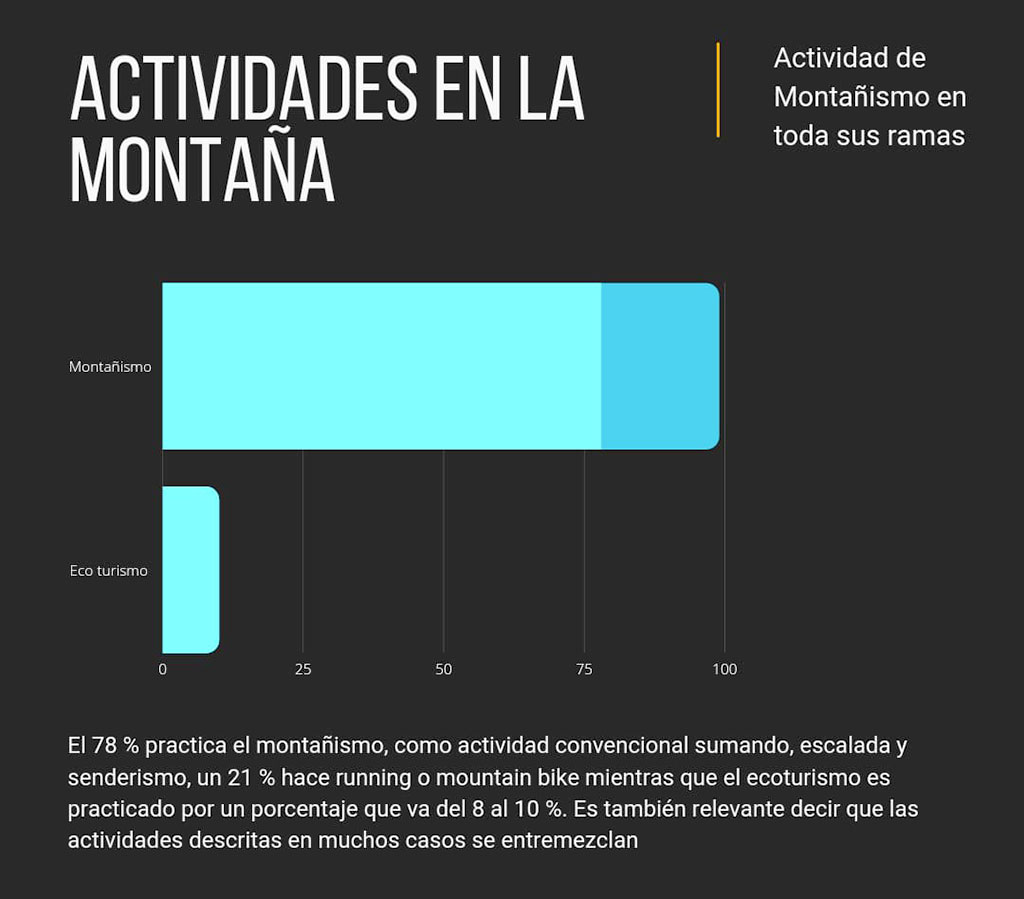 El 78 % practica el montañismo como actividad convencional haciendo escalada y senderismo, un 21 % hace running o mountain bike mientras que el ecoturismo es practicado por un porcentaje que va del 8 al 10 %. Es también relevante decir que las actividades descritas en muchos casos se entremezclan.
