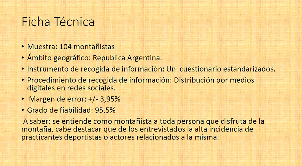 Los resultados de la encuesta realizada entre los meses de noviembre y diciembre del 2020 poseen un margen de error inferior al 4%. La investigación que tuvo como propósito conocer el perfil actual del montañista argentino, se realizó utilizando las redes sociales pero debe quedar claro que el lector puede no sentirse identificado con ese perfil ya que se trata de una generalización estadística.