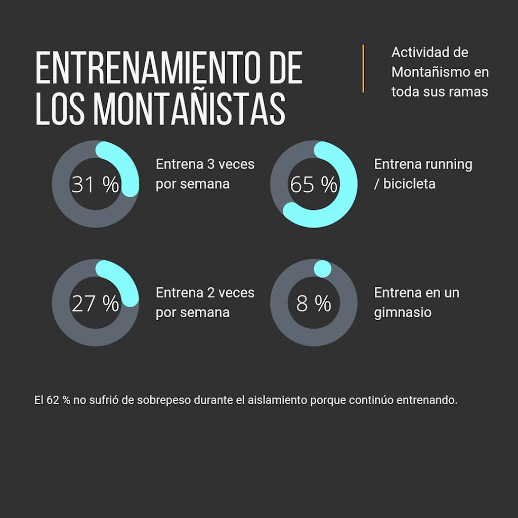 ¿Cómo entrena un montañista argentino? la preferencia es el running o ciclismo, con más del 65% y solo asiste al gimnasio un 8%. Otro 15 % lo hace en casa con una planificación que proviene de algún libro o de un proyecto anterior.