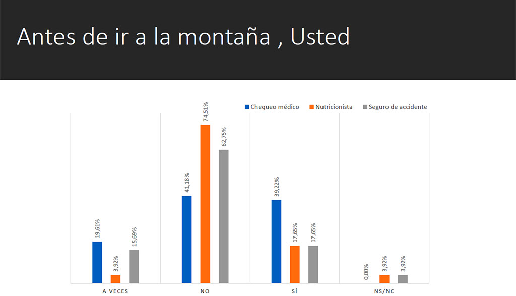 Como dato relevante se preguntó por tres actividades que se deberían realizar con asiduidad: hacerse un chequeo médico, consultar a la nutricionista y tener un seguro antes de ir a la montaña. El resultado, no es menor para revisar algunas conductas: