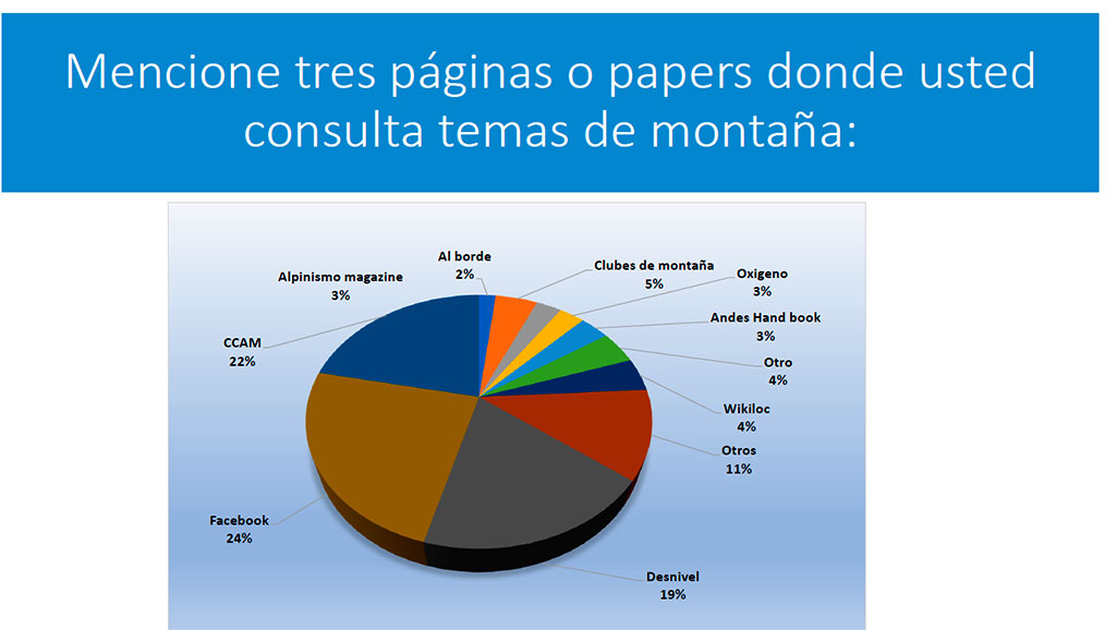 El porcentaje mayor de los montañistas que buscan información utiliza Facebook, luego otro gran porcentaje obtiene información del Centro Cultural Argentino de Montaña y en menor medida aparecen Desnivel, Oxígeno y Alpinismo Magazine.