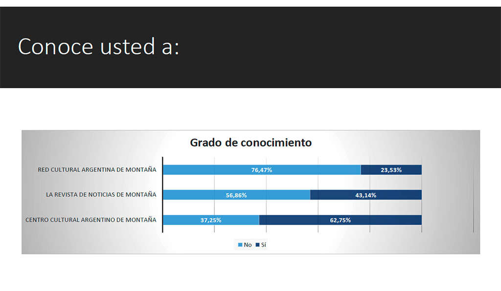 En el mes de noviembre de 2020, en el marco de las reuniones convocadas a lo largo de ese año por el Centro Cultural Argentino de Montaña, para invitar a sumarse a la institución a personas o grupos que quisieran colaborar en el desarrollo de nuevos proyectos, recibimos el ofrecimiento, de Roberto Catalá, titular de la consultora Catalá y Asociados de efectuar, ad honorem, una investigación, a través de una encuesta en redes sociales. El propósito de la encuesta que se nos ofreció era obtener el perfil actual del montañista en Argentina, como así también conocer el posicionamiento del Centro Cultural Argentino de Montaña, dentro de ese grupo de personas. Aceptamos agradecidos la propuesta y el trabajo se inició de inmediato.