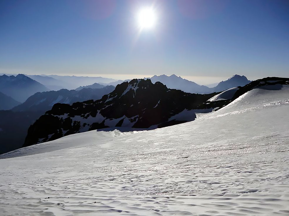 Luego se supera un segundo tramo empinado, menos que el primero de 150 mts. con una inclinación máximo de 60° para llegar a la parte superior del glaciar donde se pone plano, de allí, seguir en dirección norte del lado oeste del glaciar, al costado de un filo rocoso, para llegar a una zona plana y rocosa donde se puede vivaquear a 5000 mts., a partir del vivac, volver al glaciar y seguir subiendo en dirección NNE para llegar al filo cumbrero que es una sección rocosa sin dificultad, seguir el filo en dirección Este hasta alcanzar la cumbre principal, prever de 2 a 3 hs. para este tramo. La bajada se puede hacer por el mismo itinerario, pero es bastante larga con varios rápeles sin equipar. Lo más aconsejable es bajar por el norte desde la zona de vivac.