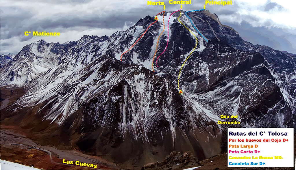 Escasas son las montañas que pueden estar a pocos kilómetros del monte Aconcagua y presumir de cierta prestancia. Tal es el caso del Tolosa, magnífico cerro ubicado al sur del más alto de América y muy próximo a la localidad de Las Cuevas; en un cordón de cumbres que separa el valle de Horcones del de Las Cuevas y del cual también son parte los cerros Dedos y México.