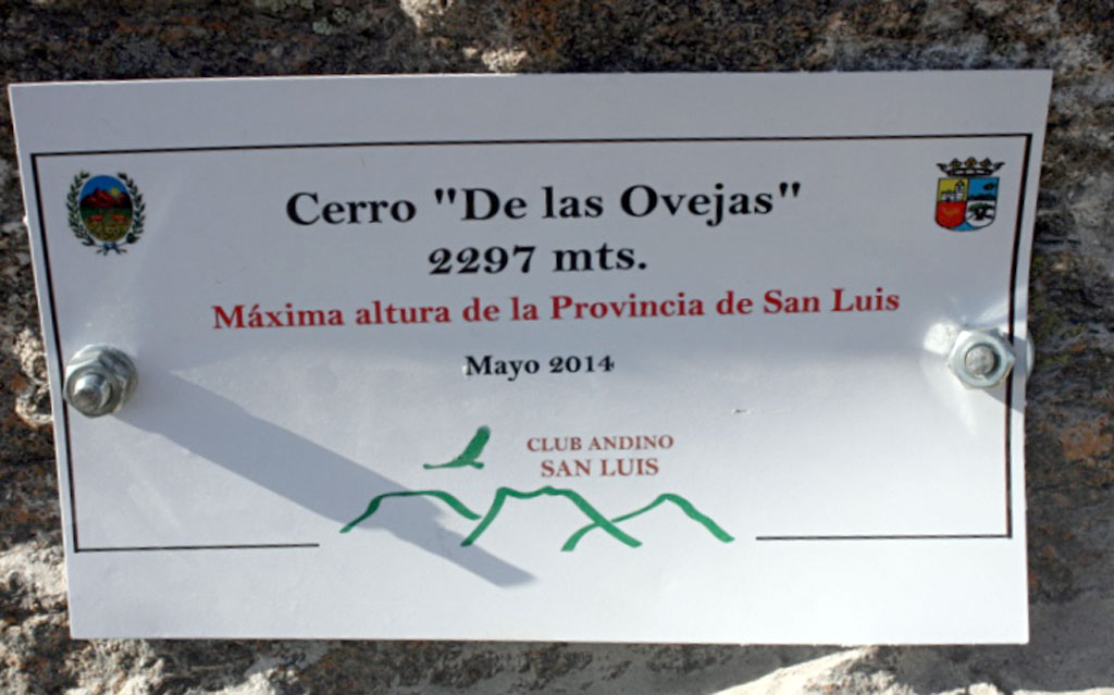 Los miembros del Club Andino San Luis instalaron en el punto más alto de la Provincia un mástil de poco más de metro y medio, pintado de amarillo, en el cual dejaron una bandera Argentina y que es visible a un par de kilómetros de distancia, también colocaron una placa recordatoria que dice: “Cerro de las Ovejas 2297 mts. - Máxima altura de la Provincia de San Luis - Mayo 2014 - Club Andino San Luis”. Como parte de la “ceremonia” que realizaron para la instalación se leyó la muy oportuna “Las Piedras” del poeta merlino Esteban Agüero.