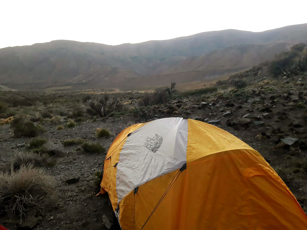 Caminamos alrededor de 3 horas y llegamos a una ciénaga de donde surgen las vertientes que forman un arroyo en donde, ya con agua, leña y una luna llena que se avecinaba, nos dispusimos a armar nuestras carpas para descansar y levantarnos temprano al día siguiente. El GPS nos marcaba que todavía estábamos en la provincia de Mendoza, colindante con el Parque Nacional El Leoncito, que alcanza una superficie de 89.900 hectáreas, en las que se entremezcla la eco-región de Monte de Sierras y Bolsones, Puna y Altos Andes.