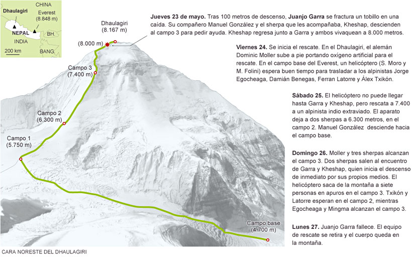 Hubiera hecho falta un trabajo enorme para salvar la delicada travesía que conduce hasta el campo 3, o contar con el helicóptero para extraer al herido antes de afrontar la travesía en la que falleció el aragonés Pepe Garcés en 2001. En esta misma montaña fallecieron en 2007, sepultados por un alud, el también aragonés Santiago Sagasta y el navarro Ricardo Valencia.