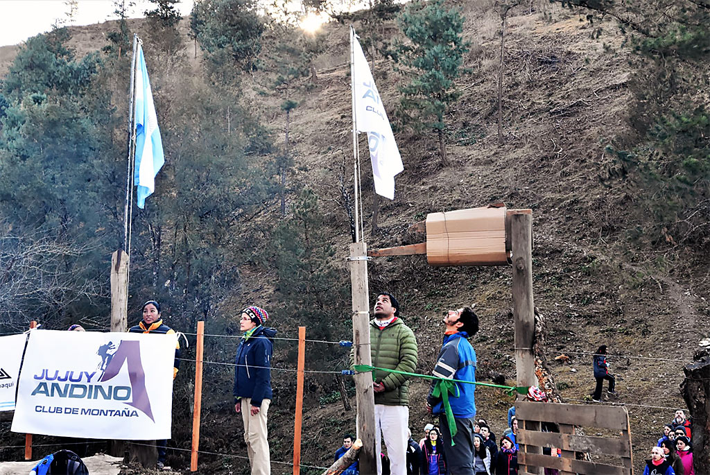 A pesar de que los montañistas se acostaron tarde la noche anterior, la mayoría estuvieron presentes bien temprano, para comenzar el día izando las Banderas. Por un lado, la Bandera Argentina: Alejandrina Lamas (Presidente Jujuy Andino Club de Montaña) y acompañaron Virginia Albornoz (Presidente de la Agrupación de Montaña Calchaquí de Catamarca) y Leonela Orio (representante de la Asociación Argentina de Montaña Aam Tucumán.). Por otro lado, la Bandera del Club: Leonardo Ljungberg (Fundador y primer Presidente de Jujuy Andino) y acompañaron Esmeralda Jamarli Entrocassi (representando al Club Amigos de la Montaña CAM de Salta, por ser la más pequeña y entusiasta con sus 15 años) y Santiago Zapatiel (representante de la Asociación Argentina de Montaña Aam Tucumán). Un momento muy emotivo, donde todos mostraron respeto y admiración por nuestras Banderas.