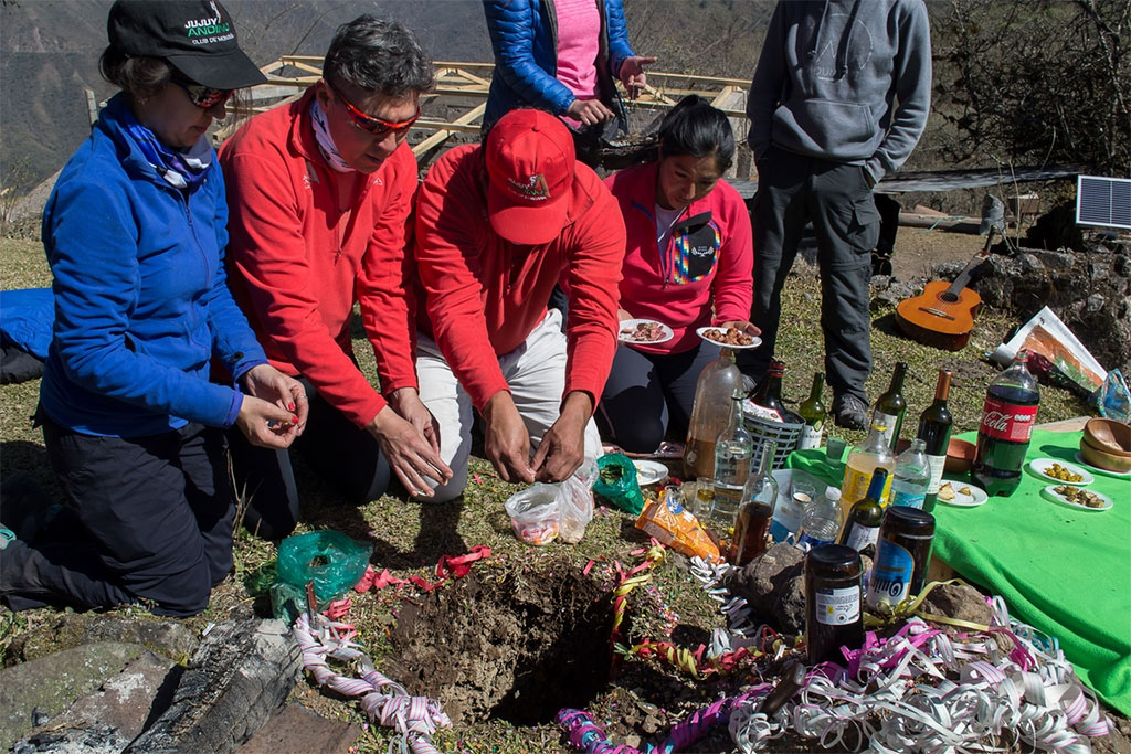 Cuando estuvieron todos de regreso del trekking y ya listo todo para comenzar con las ofrendas (previamente se hizo el correspondiente sahumado y se acomodó la comida y bebidas a un costado del pozo), socios de Jujuy Andino pidieron permiso a la Pacha para poder proceder y Alejandrina Lamas, Presidente de Jujuy Andino, comenzó con las ofrendas y le siguieron los integrantes de los otros Clubes. La ofrenda es una manera simbólica en la cual se devuelve a la Madre Tierra todo lo que hemos tomado de ella, con el fin de restablecer la reciprocidad entre el ser humano y la naturaleza. Y agradecerle también, pidiéndole por nuestros deseos más profundos acerca de la vida, lo que queremos lograr y lo que queremos para nuestros seres queridos. Las ofrendas se depositan en el hoyo cavado en la tierra, como manera de darle de comer y beber. En la “corpachada” se ofrece una parte de los alimentos y bebidas que se van a consumir en el almuerzo y al final, de cada ofrenda, se coloca un cigarrillo encendido.