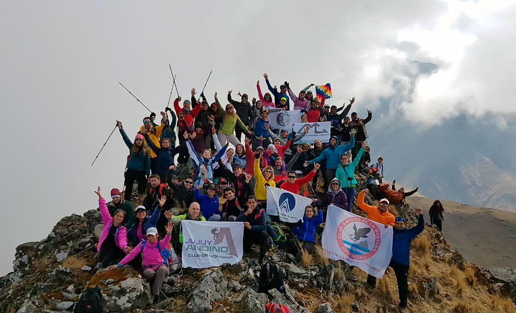 El gran grupo de 73 montañistas fue dividido en dos, acompañados por socios de Jujuy Andino y guiados por Sergio Civetta, también socio del Club y loco apasionado del Cerro. Un fabuloso ascenso en el que no faltaron risas, chistes, fotos, charlas, amistad y la emoción de estar juntos, sin dejar de lado la seguridad y responsabilidad que se deben tener en una montaña. Mientras caminaban pausadamente pero con paso firme, en fila india interminable, la montaña hacía alarde de toda su magnificencia y un cóndor les dio una cálida y emocionante bienvenida. Después de aproximadamente 4 horas caminando en subida, llegó el primer grupo a la cumbre y a los pocos minutos el segundo grupo, haciendo un total de 68 montañistas en la cumbre del Cerro Laguna, siendo un record y algo nunca visto en el lugar. Abrazo cumbrero, fotos con las banderas representativas de cada Club y descanso, para luego emprender el descenso nuevamente al campamento, donde los estaban esperando.
