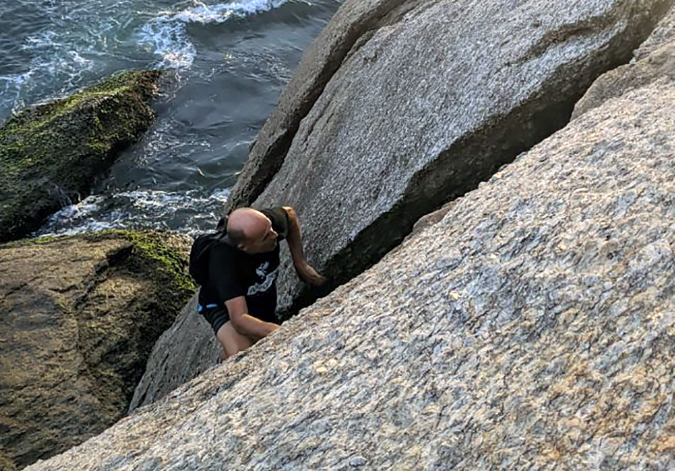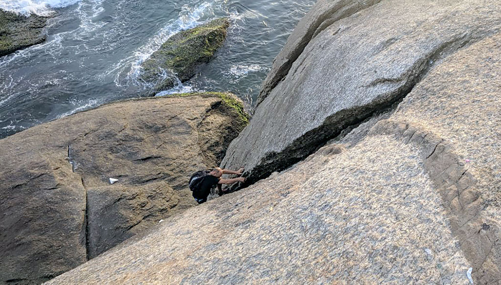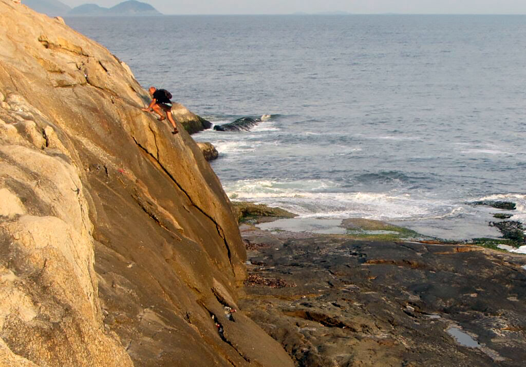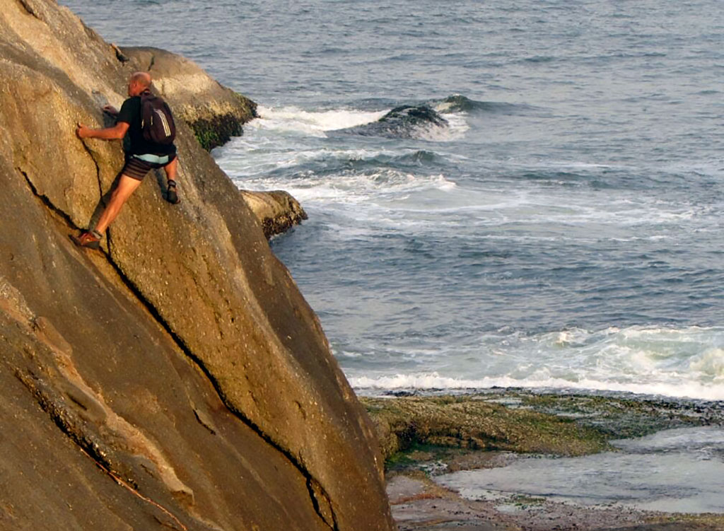 Comenzando el trek desde el este, se va en dirección sur, para ello se toma una senda claramente marcada que desciende levemente entre un pequeño bosque de cactus y pencas en sendero de tierra, luego comienza a subir x la roca y encontramos unas incrustaciones muy pulidas de granito rosa tipo “diaclasas horizontales”, excelente lugar para hacer ejercicios de adherencia en travesía y tracción de brazos, hasta aquí llevamos en total 80 – 90 mts de recorrido; luego se gana un poco de altura y a metros del borde encontramos paredones de 8 – 10 mts que caen prácticamente al mar, allí hay una enorme piedra incrustada en el mismísimo batolito, es un excelente anclaje natural para equipar con cintas o retazos de cuerda para top-roping y realizar descuelgues o incluso aseguramientos desde arriba. El potencial de ese lugar, que da al sur, es enorme, se pueden realizar itinerarios cortos, de mediana dificultad y bien protegidos.