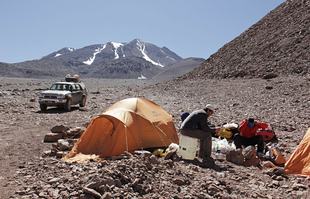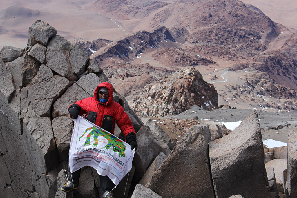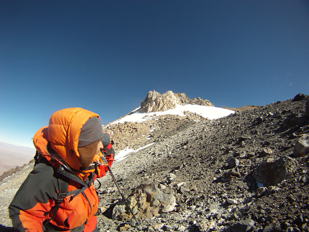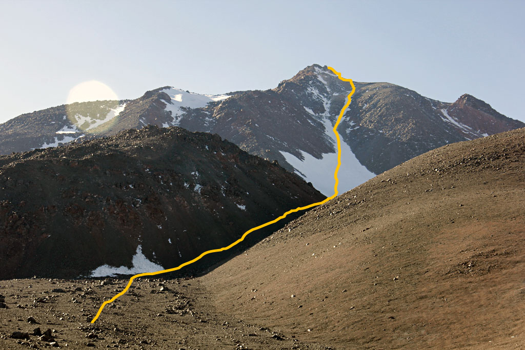 El 6 de mayo todo el equipo se dirigió hasta Tolar Grande y el día siguiente hacia la base del volcán a los 4.460 metros. El 8 de mayo partieron por un camino bien marcado hacia el sector sur a una altura de 5.050 metros, donde permanecieron dos días para una óptima aclimatación. El 10 de mayo Guillermo Glass, Sebastián Cura, Jaime Soriano y Christian Vitry partieron para instalar el campamento de altura a los 5.800 metros. A la madrugada del 11 de mayo los cuatro montañistas estaban ascendiendo por la canaleta que conduce directamente a la cumbre, a la cual llegaron a las 10 de la mañana, luego de 5 horas. Para el descenso optaron por la vertiente oriental del “sarcófago”, una colada de lava que ofrece acarreos que facilitan la bajada.