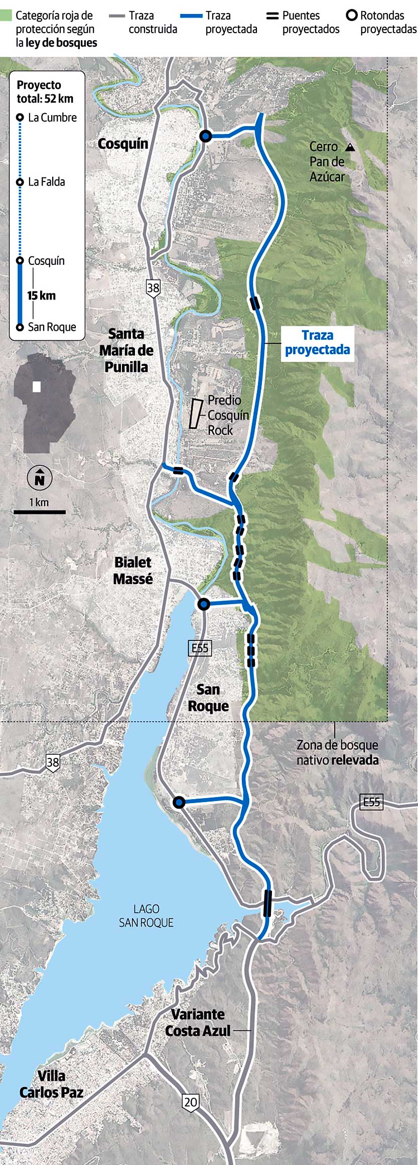 El informe técnico plantea una obra de 47 kilómetros. La Provincia anunció una ejecución por etapas: para este año, licitaría la primera, que involucra 14,3 kilómetros entre San Roque y Cosquín. El proyecto técnico y el estudio de impacto ambiental se concentran hoy sólo en ese tramo.