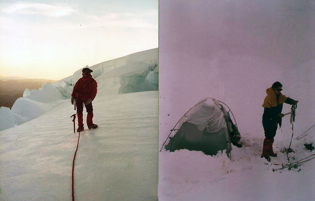 Descendimos del cerro utilizando la técnica del rappel. Llegamos nuevamente a la cueva de hielo que habíamos tallado en el glaciar. La desagradable sorpresa fue que nuestras bolsas de dormir se habían mojado estaban inutilizables. Obviamente no habían quedado lo suficientemente protegidas con nylon para evitar este desastre. No había sido una buena idea o no fuimos lo suficientemente precavidas, errores que suelen cometerse. Error que muchísimas veces nos ha apenado.