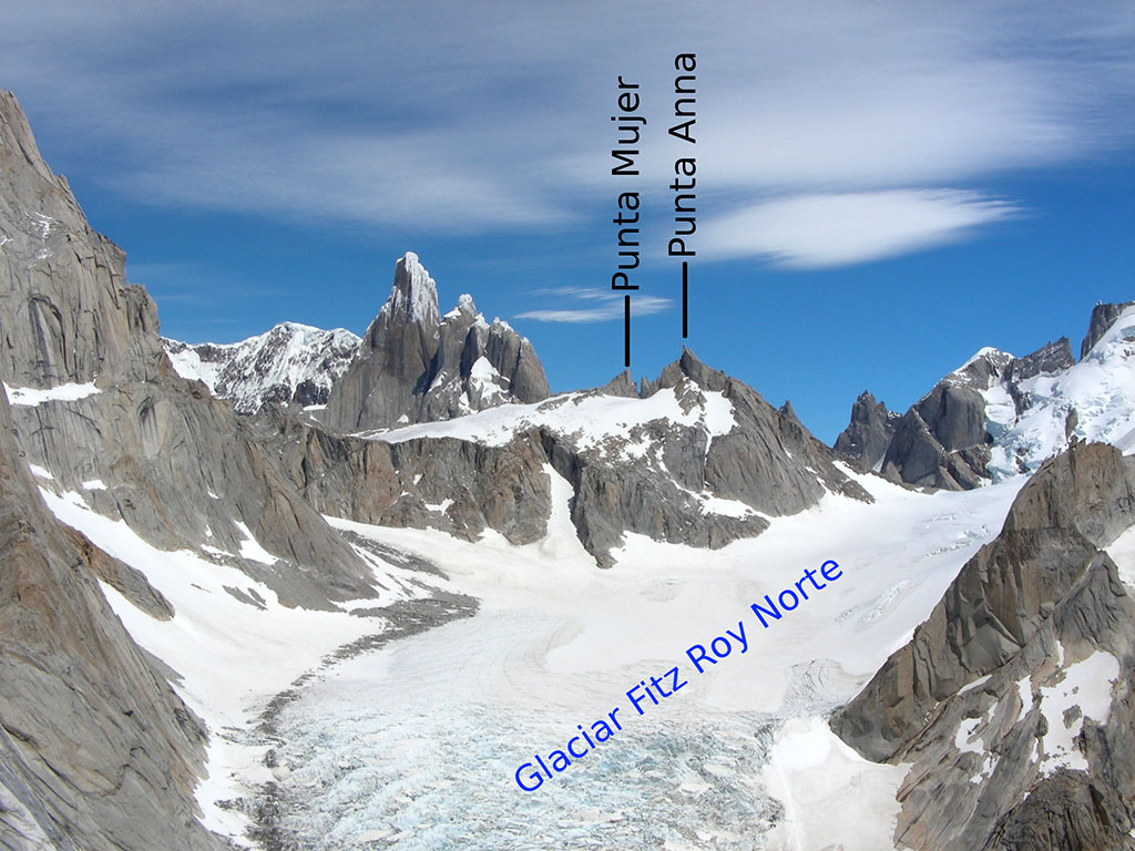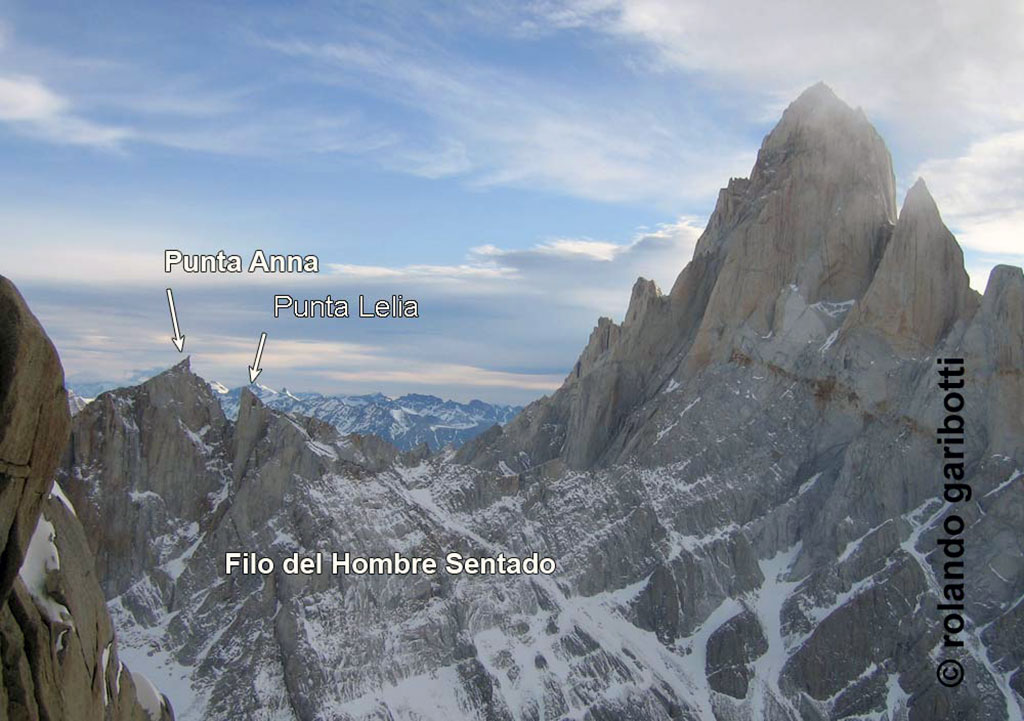 [Nota de Redacción]: la cresta entre la cara oeste del cerro Fitz Roy y el Boquete del Pier Giorgio se llama Filo del Hombre Sentado (Lliboutry). El nombre hace referencia a su cumbre, una torrecita al oeste que parece un hombre sentado. A fines de los años 40 Hans Zechner la bautizó Cerro Muñeco, pero su nombre fue ignorado por Lliboutry. Cesare Maestri dice haber escalado esta torre en 1958 y la rebautizó con el nombre de Punta Anna, en memoria de su hermana. También dice haber escalado otra torre apenas al este que llamó Punta Lelia. {Patagonia Vertical. Rolando Garibotti y Döerte Pietron.Sidarta. 2013.}