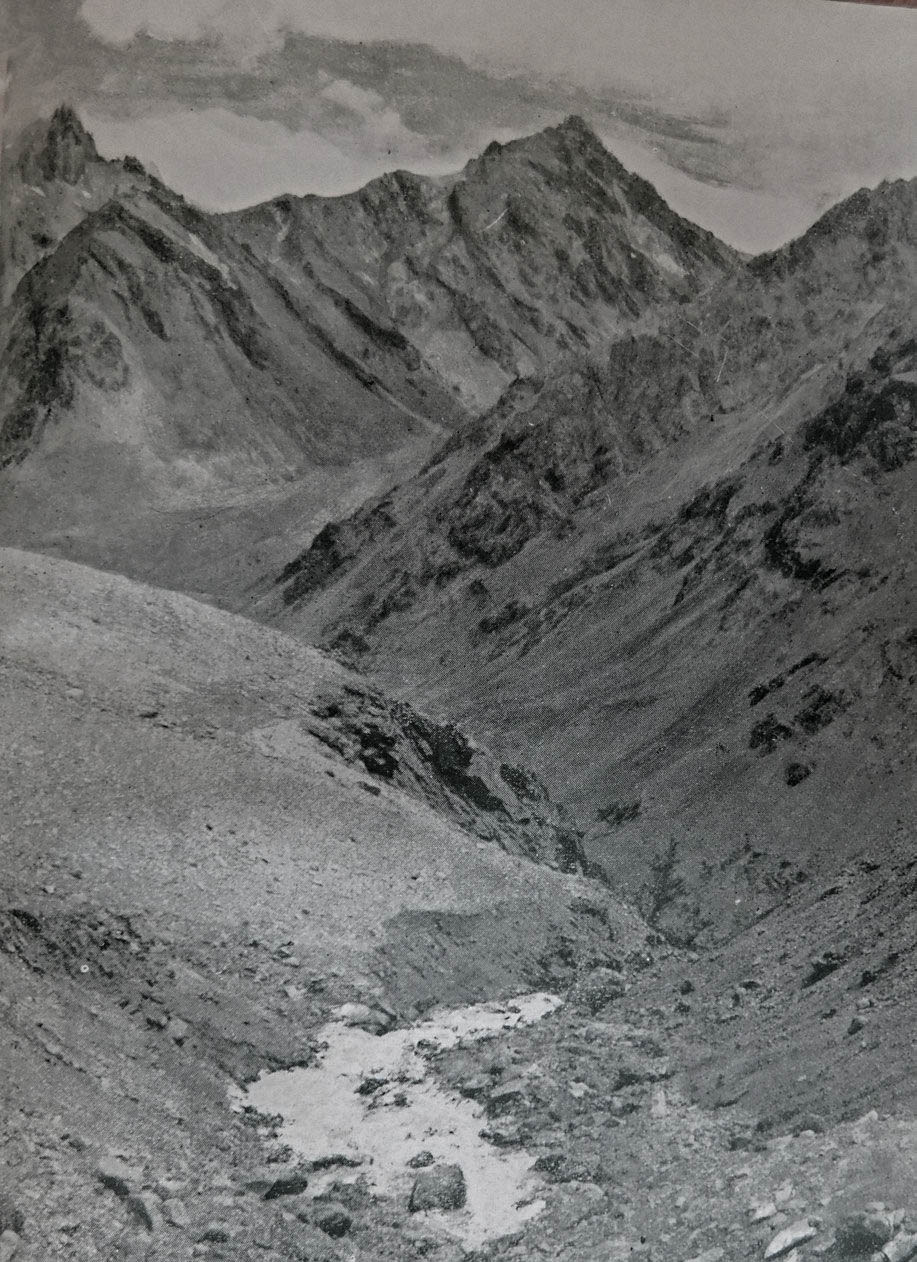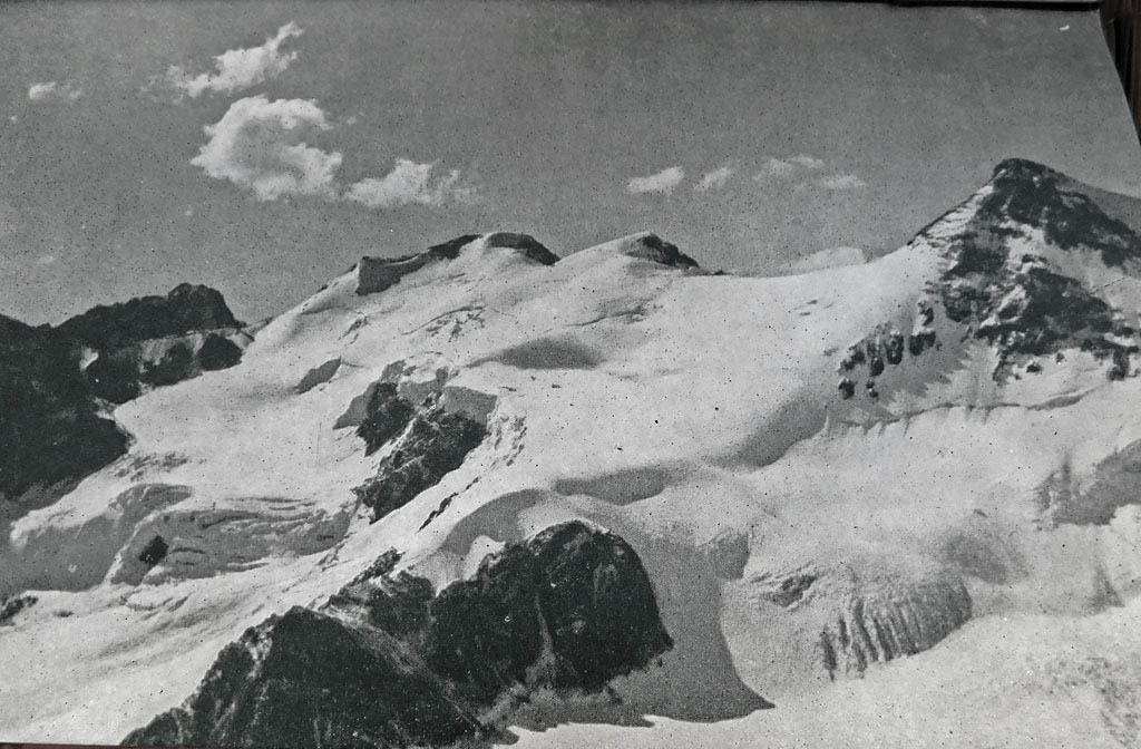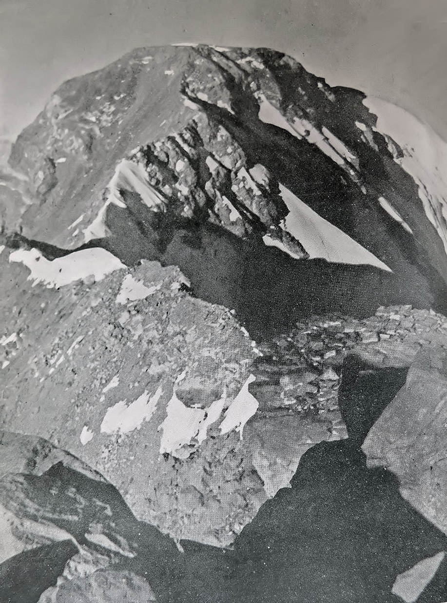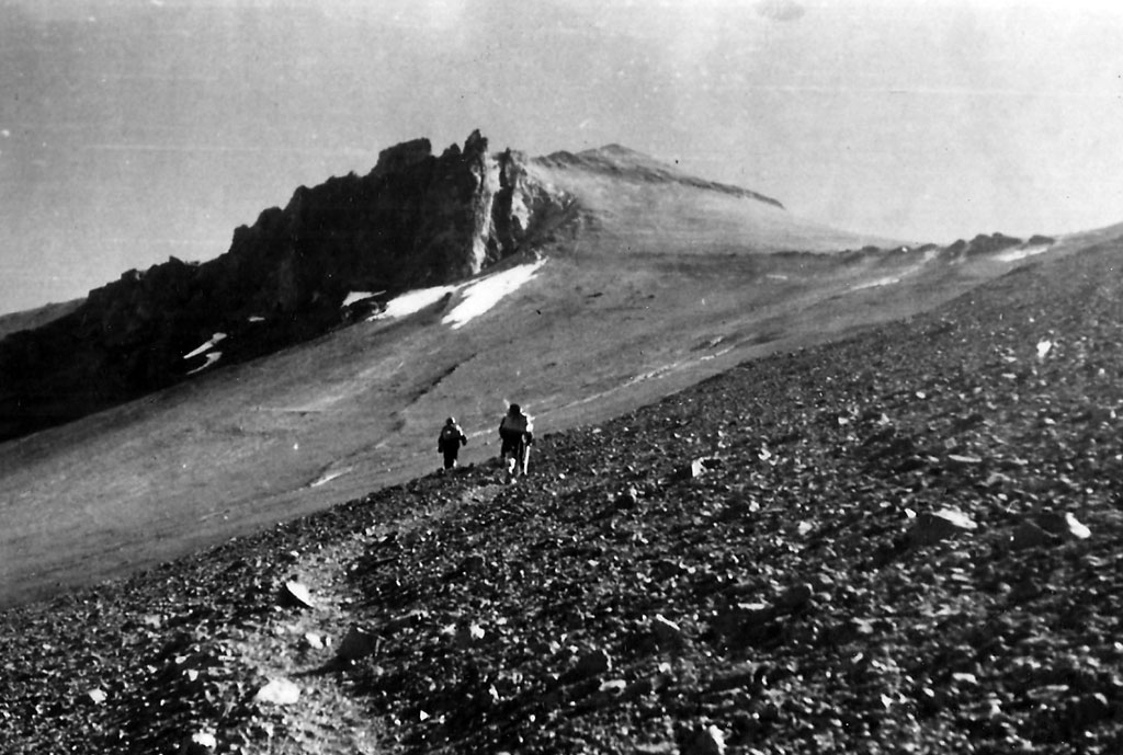 Nosotros dos seguimos por rocas hacia el acarreo. A las catorce lo alcanzamos, al igual que el año pasado. Con una marcha pesada pasamos por el “lugar de Link”. Cruzamos un poco por abajo el lugar donde el año pasado estaba la señora Link muerta hacia la derecha hacia la arista cimera, la que alcanzamos a las quince treinta. Un descanso: decidimos intentar el ataque a la cumbre Sur sin tomar en cuenta lo que podía pasar.