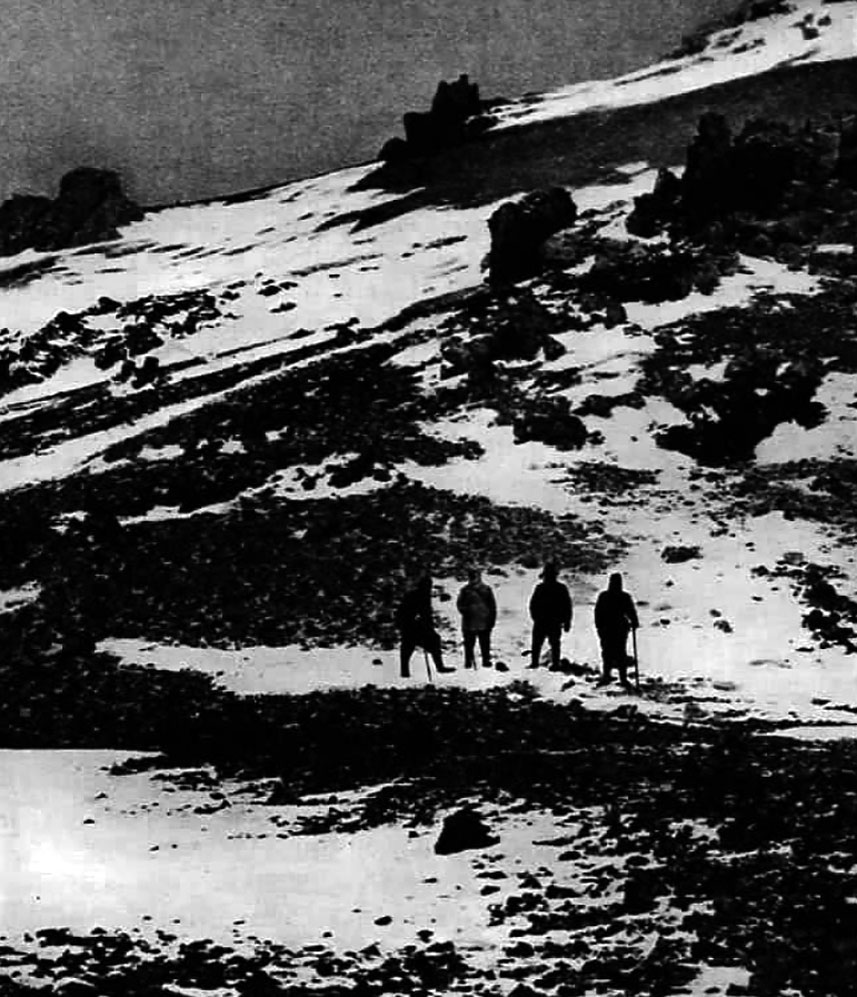 A las dieciséis comenzamos el ataque decisivo. Resulta magnífico caminar por una arista sobre abismos; se eleva y vuelve a bajar. Entre las dos cumbres vemos, de pronto, un cadáver. ¿Otra tragedia humana? ¿Pero quién? ¿Quizás Freile que no fue encontrado en 1947? [Nota: Ruperto Freile y Fernando Solari fallecieron en el Aconcagua el 16-2-1937, después de haber llegado a la cumbre] Al acercarnos lo reconocemos de inmediato: es un animal. ¡Un guanaco! Acurrucado, recostado sobre piernas dobladas con restos de piel solo en el abdomen. La cola nos la llevamos como prueba del animal. Hizo crac al sacarla. ¡Un animal a casi 7000 metros de altitud! ¿Qué lo trajo hasta acá? ¡Para venir a morir!