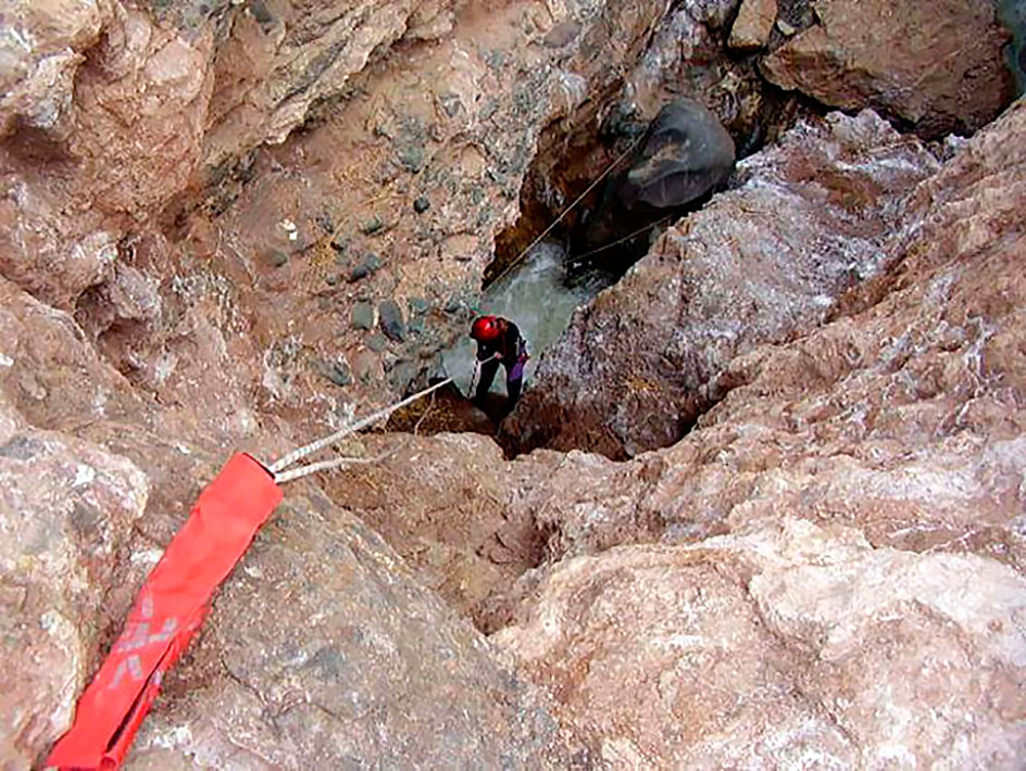 Comenzamos el descenso por la ladera del acantilado de 100 mts. de altura, una zona de derrumbes con tanta pendiente que de habernos resbalado la historia hubiese sido otra, siguiendo la huella de las cabras pudimos arribar al techo de la caverna y desde allí nos quedaba un rappel de 15 mts. al cauce del río.