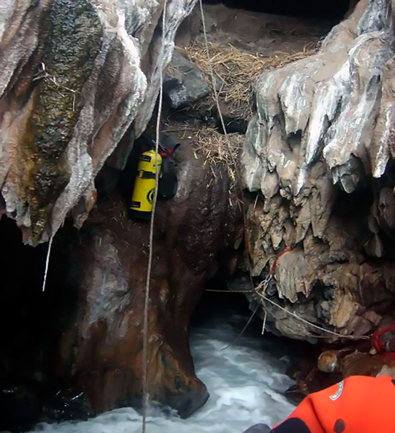 La fuerza de arrastre del agua era tal que cualquiera que se hubiese soltado de sus mosquetones en el intercambio entre cuerdas, la corriente lo habría arrastrado ahogándolo en alguna sala dentro de la caverna, por que como vimos después la salida estaba bloqueada debido a que el nivel del agua llegaba hasta el techo de la misma.