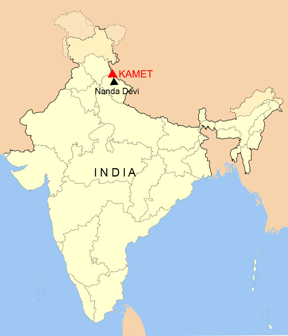 El cerro Kamet, ubicado en el Garhwal-Himalaya, India. Tiene una altitud de 7.756 metros SNM. El Kamet es una montaña perteneciente a la cordillera del Himalaya, ubicada en la provincia india de Uttarakhand, que marca la frontera con Nepal y la región autónoma tibetana. Ubicado a los 30° 55’ 12” de latitud Norte y a los 79° 35’ 36” de longitud Este de Greenwich.