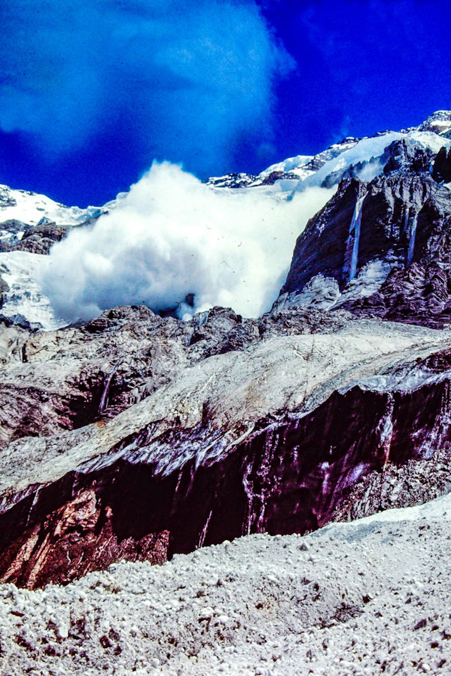 En la madrugada se escuchó un estampido y Mario que estaba a mi lado me dijo “da la espalda hacia fuera que viene una avalancha” Y pasó -como una lechada de cemento- la clave fue no oponer resistencia a los bloques de hielo que nos golpearon la espalda como si fueran puños. Al salir de la bolsa de dormir lo único que buscamos fueron los crampones ya que sin ellos estábamos perdidos.