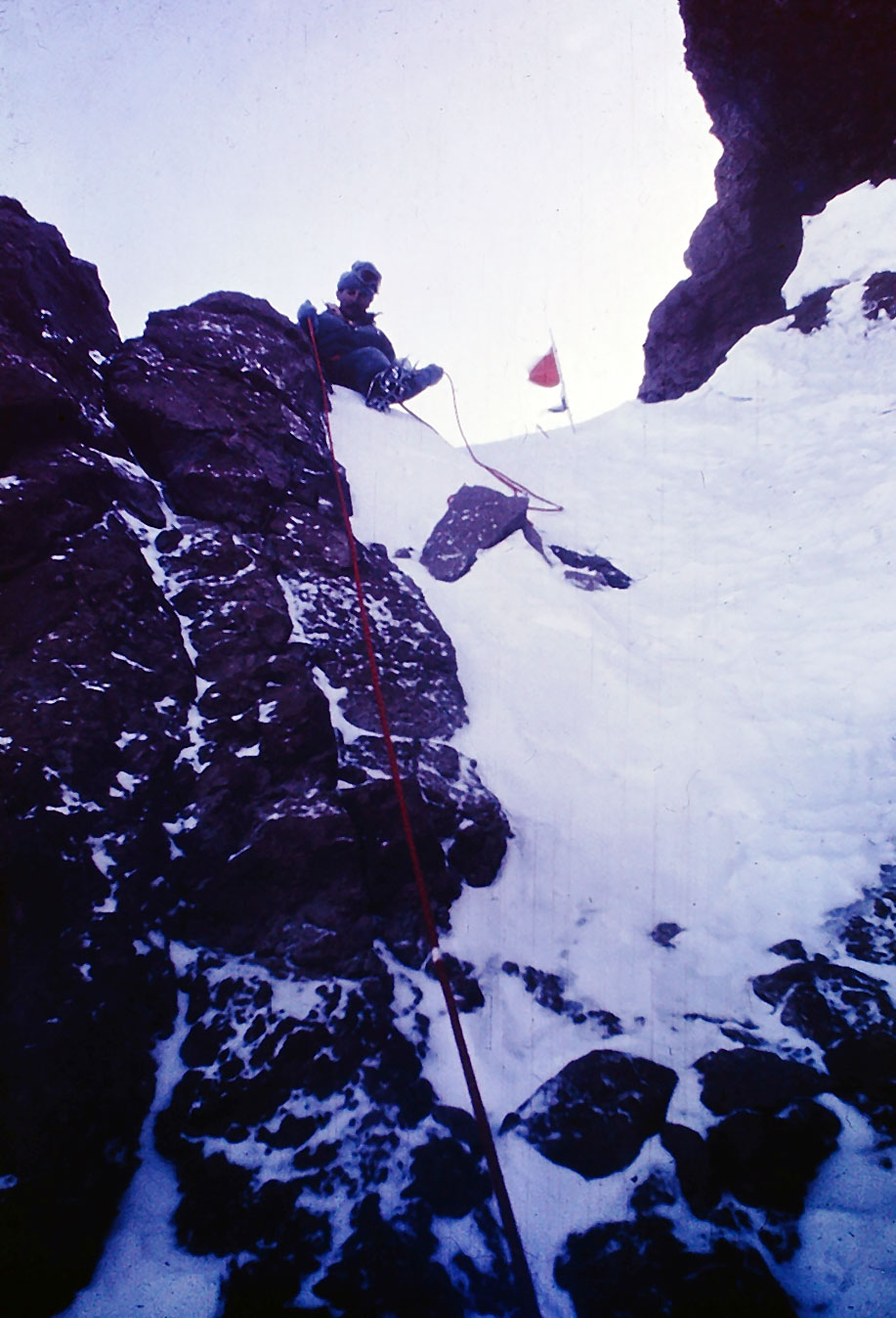 Seguí ascendiendo lentamente por la empinada ladera nevada, buscando rocas con fisuras aptas para colocar un clavo que permitiera dar seguro a mi compañero, una vez logrado, volví a subir, bordeando unas altas rocas negras, seguí ascendiendo sin encontrar una fisura confiable, en un descanso buscando el oxígeno que me faltaba alentándonos mutuamente.-