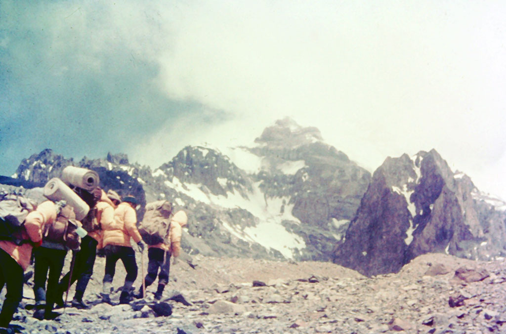 Esta vez nos acompañaban Juan Carlos Toscano y Ricardo Gabriellli en una cordada y Mario y yo en la otra. La marcha fue con pocas mulas y cargas hasta Plaza Francia, ya que la escalada era rápida. Llegamos al campamento I con las avalanchas que pasaban a metros de nuestra carpa y provocaban un fuerte viento.
