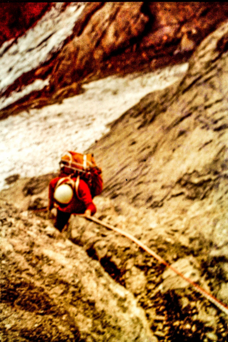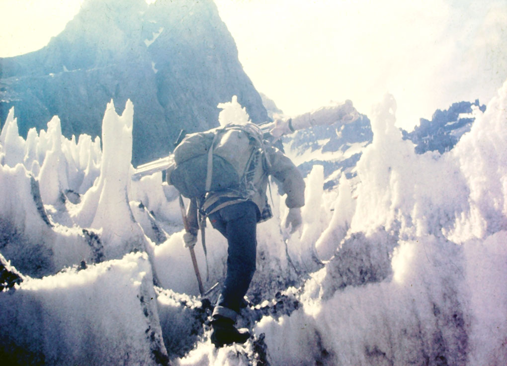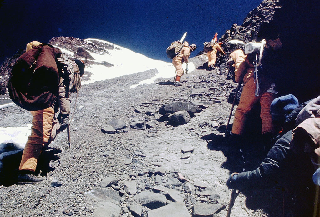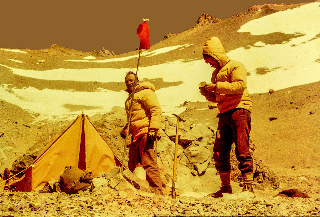Continuando el ascenso, que se volvió lento y extenuador, pensaba y mientras lo hacía me preguntaba ¿Por dónde habrán subido Aikes y Pellegrini?, mi mente embotada e imbuida de la rutina de mantener el paso sin perder la respiración lo pensaba una y otra vez, habiendo recibido por radio la noticia de que lo habían logrado por la ruta del verano anterior en 1965, en una larga y lenta escalada, que les llevó varios días.