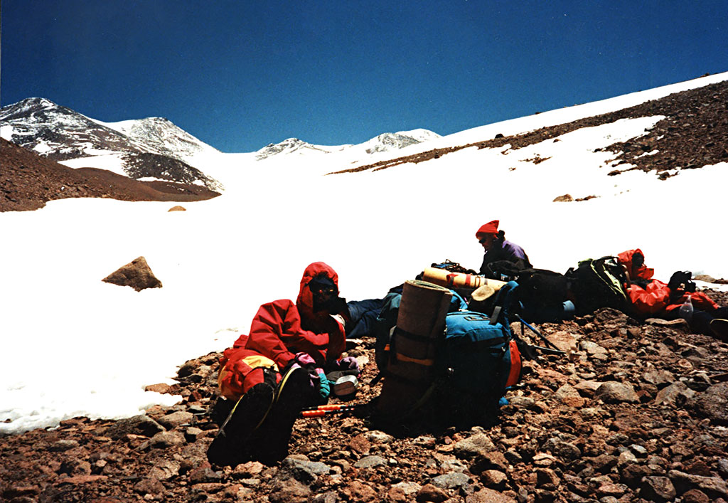 Desde allí se continúan unos 6 km mas primero en sentido O-E y luego N-S hasta el Campo Base Oeste (27º 43’ 04,5’’ S / 68º 54’ 00,8’’ O, 5.000 m) ubicado en las laderas del Volcán Tres Picos (5.979 m) y en la margen de un arroyo con agua liquida.