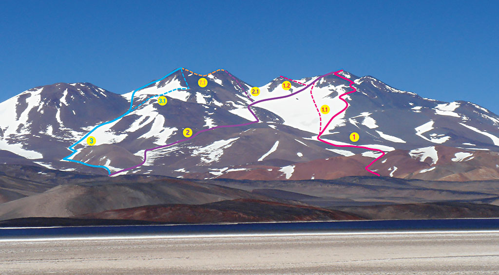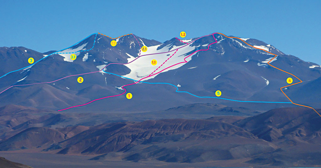 Observaciones: Existen sutiles variantes para toda la ruta. La primera jornada puede resolverse por una quebrada paralela (Qda. de los Penitentes) e incluso por el filo intermedio. La segunda jornada puede hacerse por fuera del glaciar, por el acarreo. La tercera puede realizarse por atrás del promontorio, aunque esto sería mas largo. Algunos grupos instalan tres campamentos de altura, el primero a 5200 metros, el segundo a 5750 y el tercero a 6250 metros, buscando de esta manera hacer más descansado el recorrido.