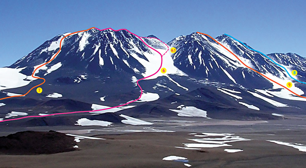 Otra opción es avanzar hasta el collado al oeste del promontorio que se observa por delante de la cumbre principal a 6270 metros (27°44’52”S / 68°47’18”O, 6.270 m). En este caso se debe continuar desde el C2 (5.900 m) por el glaciar hasta los 6230 y se sale del mismo bordeando el promontorio anterior a la cumbre principal.